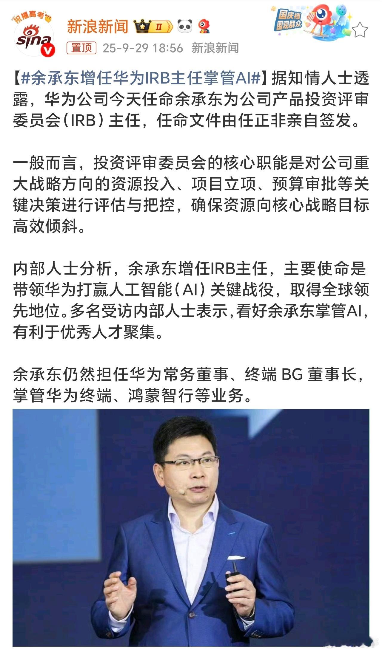 余承东增任华为IRB主任掌管AI余总增任华为公司IRB主任,将负责华为AI战略,打赢未来AI关键战役!这就是华为虎将余承东,哪里需要攻坚克难就站在哪里[允悲]!