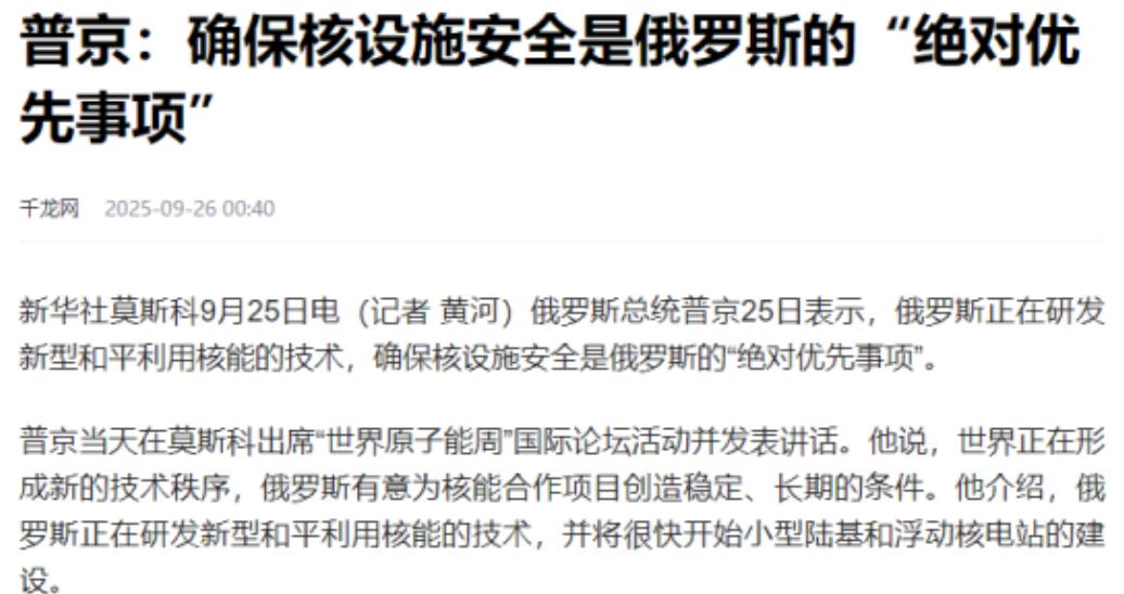 俄罗斯总统普京公开承诺了! 9月26号,莫斯科扔下了个大新闻。普京在“世界原子能周”的论坛上,当着国际原子能机构总干事格罗西的面,说俄罗斯会尽力支持全球核安全。 要知道,就在三个月前的6月11日,俄罗斯还派出图-160战略轰炸机群对基辅实施空袭,这些能携带核弹头的"空中巨兽"向乌克兰决策中枢倾泻常规弹药,赤裸裸地展示核威慑。更早的9月12日,俄白"西部-2025"联合军演中,俄罗斯还模拟用伊斯坎德尔导弹对波兰目标实施核打击训练。这种"核大棒"与"核安全承诺"的强烈反差,让人不禁要问:普京到底在打什么算盘? 俄罗斯的核政策向来是"说一套做一套"。2020年普京签署的核威慑政策就明确表示,当国家生存受到威胁时,核武器可以作为最后手段。2024年修订的新版核学说更是将核保护伞扩大到白俄罗斯等盟友。这种"核讹诈"与"核安全"的双面策略,本质上都是为地缘政治服务。 如今在乌克兰战场陷入僵局之际,普京突然转向核安全承诺,很可能是想通过"软硬兼施"的策略分化西方阵营,为俄罗斯争取喘息之机。 国际原子能机构总干事格罗西对普京的表态表示欢迎,但西方国家的反应却相当谨慎。美国国务院发言人直言:"俄罗斯的核安全承诺需要实际行动来验证。"这种怀疑不无道理——就在普京表态前一周,乌克兰无人机还袭击了俄罗斯多个炼油厂,这些设施为俄军提供着关键燃料。俄罗斯此时抛出核安全承诺,既可能是为缓和紧张局势,也可能是为后续军事行动争取国际支持。 从技术层面看,俄罗斯的核安全承诺也有现实考量。俄罗斯计划2030年建成世界首座封闭循环核电站,能将95%以上的核废料循环利用。这种先进核技术正是俄罗斯对外合作的重要筹码。通过支持全球核安全,俄罗斯既能提升国际形象,又能为核技术出口铺路。目前俄罗斯已与中国签署"月球核电站"备忘录,计划2035年前在月球建造自动化核电站。这种"核外交"既能突破西方制裁,又能巩固与新兴大国的关系。 乌克兰战争的最新进展或许能解释普京的突然转变。9月19日,北约一列秘密导弹运输列车在乌克兰境内被俄罗斯精准摧毁,这批弹药本可支撑乌军一周高强度作战。与此同时,乌克兰总统泽连斯基突然改口表示愿意停火谈判。战场形势的变化让俄罗斯看到了结束战争的契机,此时抛出核安全承诺,既是对西方的安抚,也是对乌克兰的施压。 普京的核安全承诺就像俄罗斯的核政策一样,充满了战略模糊性。它既可能是真诚的姿态,也可能是战术的伪装。但有一点可以肯定:在乌克兰战争进入第四个年头的今天,任何关于核安全的表态都值得国际社会高度关注。毕竟,核武器的阴影从未真正远离这场冲突,而俄罗斯的"核双簧"仍在继续上演。