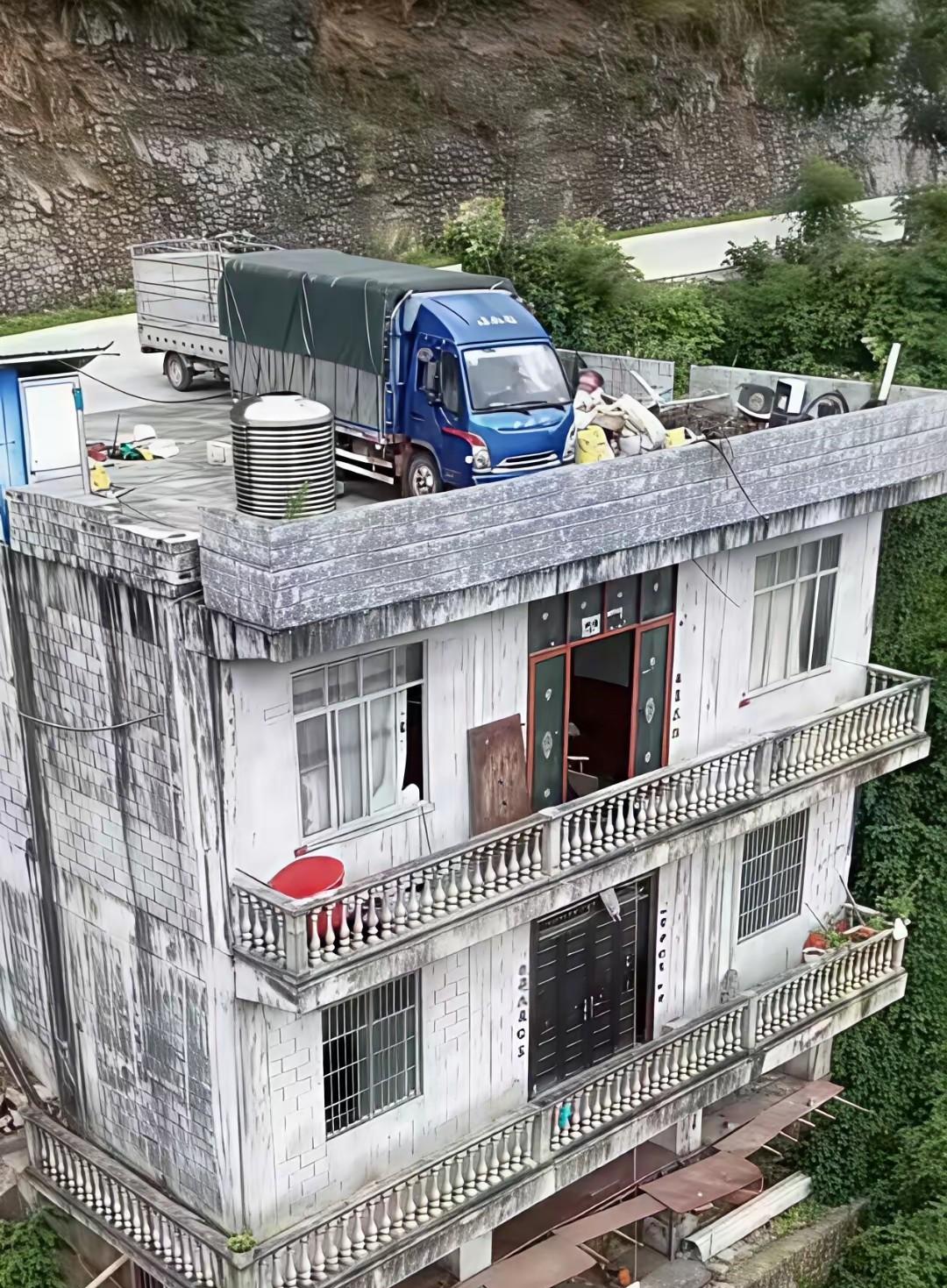 很纳闷,这辆小车是怎么上去的?这是楼顶呀,这么大的重量楼能不能承受的住?