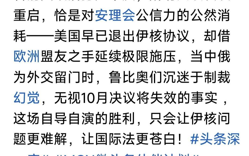 卢比奥感谢英法德,推动联合国重启对伊朗制裁!制裁共有六项:禁止伊朗浓缩铀,恢复对伊朗核计划,弹道导弹计划与武器贸易计划的限制。 按说一个主权国家,发展民用核能属于正当权益,研发弹道导弹,进行武器贸易,别国无权干涉。为何美欧禁止伊朗浓缩铀,限制以上计划呢? 说一千道一万,还是伊朗冒犯了美欧! 冒犯老美是因其扶持“哈真胡”,不仅与当地政府作对,还与美国在中东的“铁杆兄弟”以色列作对引起的? 冒犯欧洲是因俄乌战争,伊朗为俄提供“沙赫德”系列无人机,助俄与乌作战,侵犯了欧洲所谓“核心利益”? 如此两个罪名,足以让美欧对伊朗“恨之入骨”,长期对其制裁。近年美伊数次谈判,均无取得进展突破。 美欧不准伊朗拥有核武器!伊朗不想放弃核权利。双方争执不下,谈谈停停。最近因伊朗支持“哈真胡”,还被美伊轰炸一番,使核设施损失严重。 但这次轰炸,也使美伊“核谈判”再次中止。伊朗挨了炸,再次宣称“不放弃核权利”!英法德推动联合国,重启对伊朗制裁,就是在此背景发生。 英法德推动制裁伊朗,实则帮了美国的忙!因此卢比奥才对他们表示感谢?是否他们事先通过气,是美国让英法德行动的?人家毕竟都是北约嘛! 苍狼写到这里,忽然想到一件事:为何欧洲在伊核问题上,与美站在一起,愿为美国打头阵?而在巴勒斯坦问题上,却与美以唱反调,力推“巴勒斯坦”建国呢?是否也是双方“演双簧”? 这出“双簧戏”,可谓“一箭双雕”!一是促使哈马斯释放人质解散武装,退出加沙解甲为民;二是推动巴建国,让巴人自食其力甩包袱!因为世界援助巴勒斯坦几十年,还要援助多久呢? 当然若哈马斯不缴枪,只能任以色列继续清剿,彻底把他们铲除!然后再说巴勒斯坦建国,也是一种选择。 据悉美国最新提出,以哈结束冲突“21条”,内容就是如此。听说哈马斯同意了“21条”,不知道是真是假? 关键以色列同意吗?如果它不同意,找借口继续铲除哈马斯,谁能奈何?反正哈马斯不除,事情不好办啊! 最后再说一下伊朗:为何支持“哈真胡”?四处扶持“反政府武装”?省下这笔钱,用于国家发展与民生不好吗? 遵“背后老板”之命行事?还是想当中东“什叶派”老大?这两条路都不好走,回头是岸融入世界岂不是更好? …………