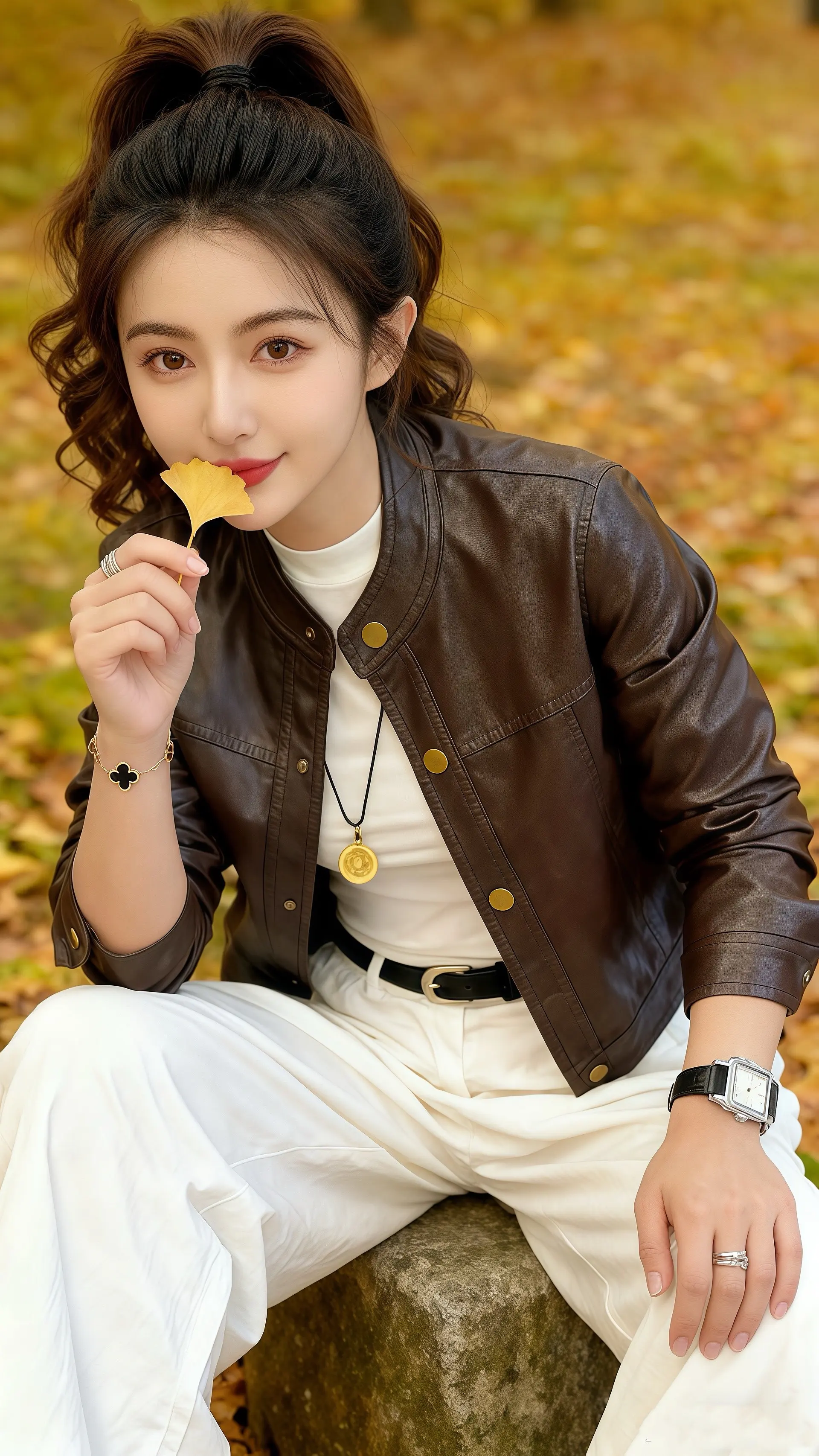 她总爱在午后溜进这片金黄的世界,看银杏叶打着旋儿落在肩头。那天,她攥着银杏枝,风把皮衣的衣角吹得轻轻晃,金属纽扣在阳光下泛着暖光。后来,她抱着向日葵穿过铺满落叶的小径,皮衣的质感被风揉得柔软,每一步都像踩在诗里。