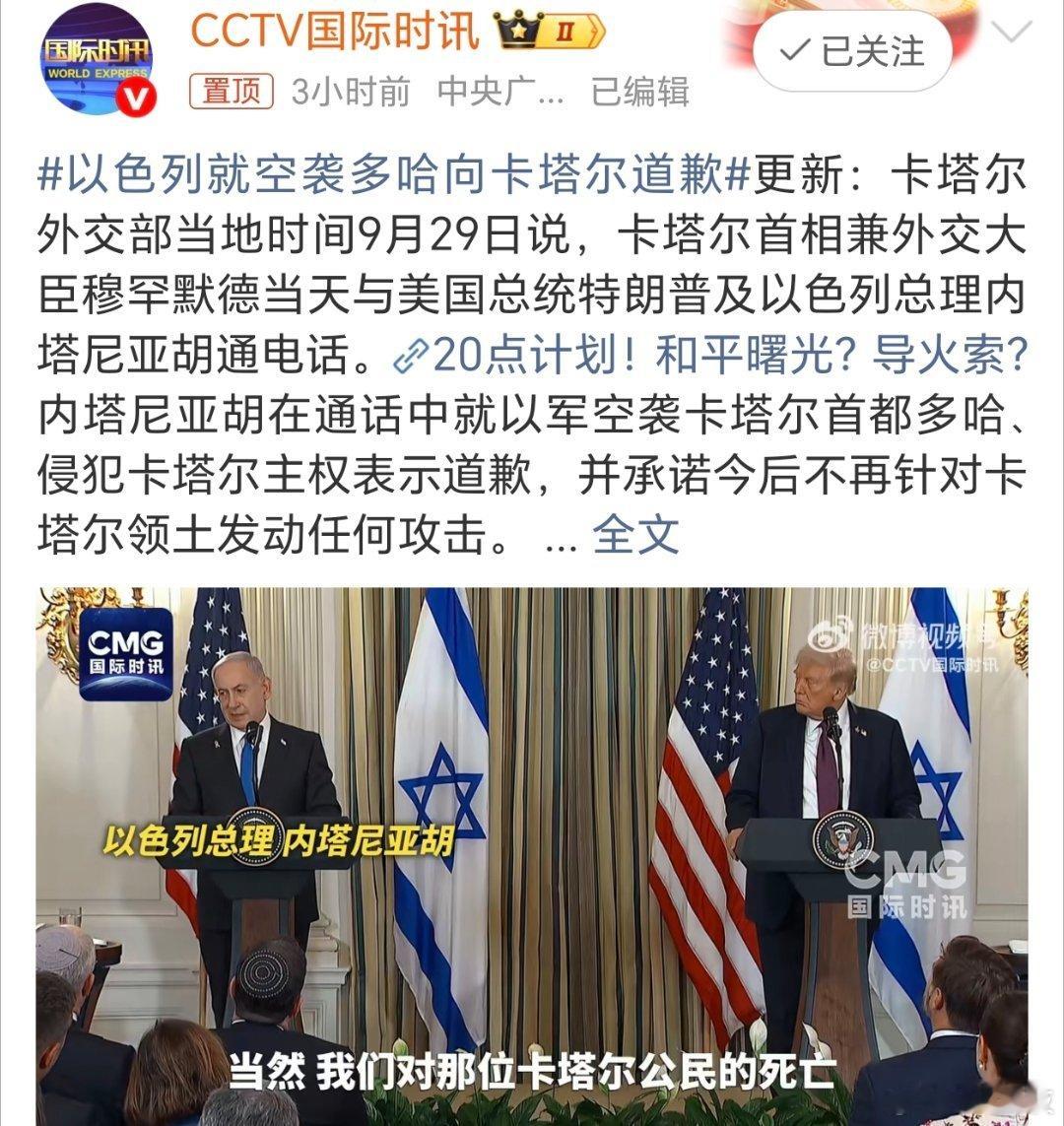 啊?你内塔尼亚胡不是中东小霸王?不是要警告整个世界,怎么就怂了[doge][doge][doge]以色列就空袭多哈向卡塔尔道歉以色列承诺不再攻击卡塔尔