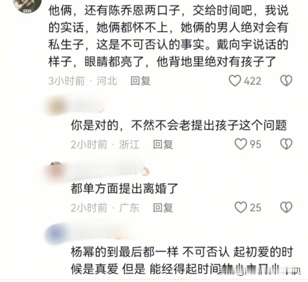 戴向宇被传有私生子? 我特意去搜了那个视频,看完后也有点同意网友的猜测了! 他说结婚后刚开始那两年还觉得挺幸福,但是如果没有孩子,夫妻之间的语言交流就会越来越少。 所以他认为孩子在婚姻中还是挺重要的。 这段视频里,戴向宇一直在强调孩子对于婚姻的重要性,言外之意就是,他不能接受已经生不了孩子的陈紫函。 另外,他在谈到孩子对于家庭的意义时,两眼放光,那种感觉不像是憧憬,更像是已经体验过了的兴奋感和幸福感。 所以我也倾向于,他应该已经有孩子了。 至于孩子是不是和陈紫函生的,就不得而知了。 陈紫函,戴向宇