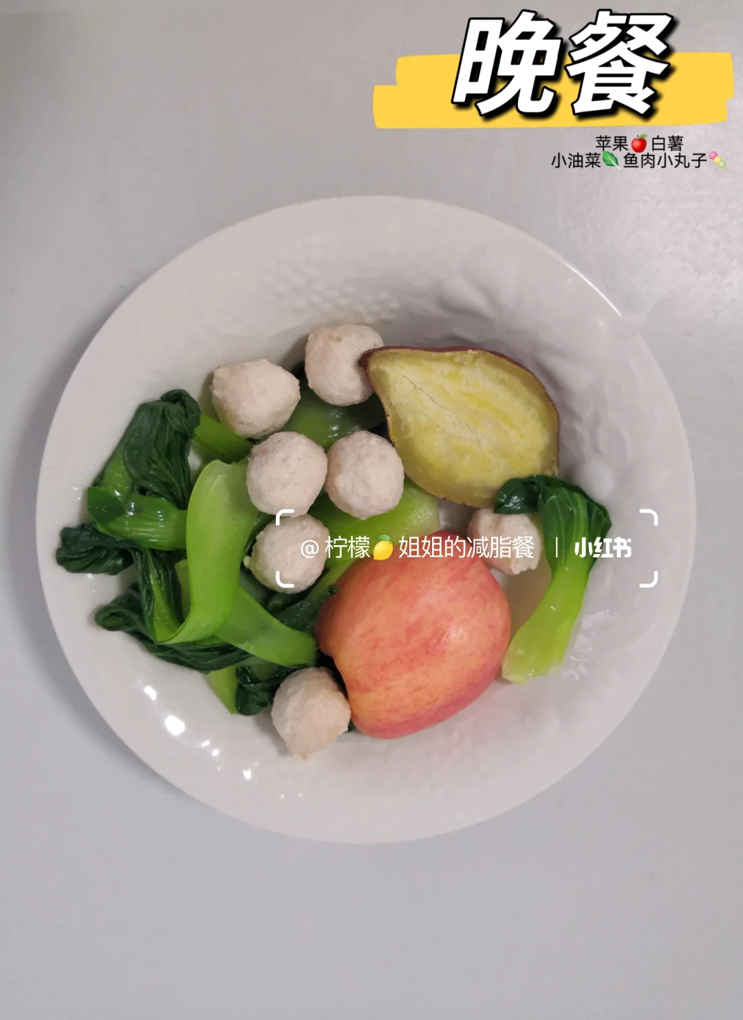 晚餐⏱:苹果🍎白薯,小油菜,鱼肉小丸子🍡