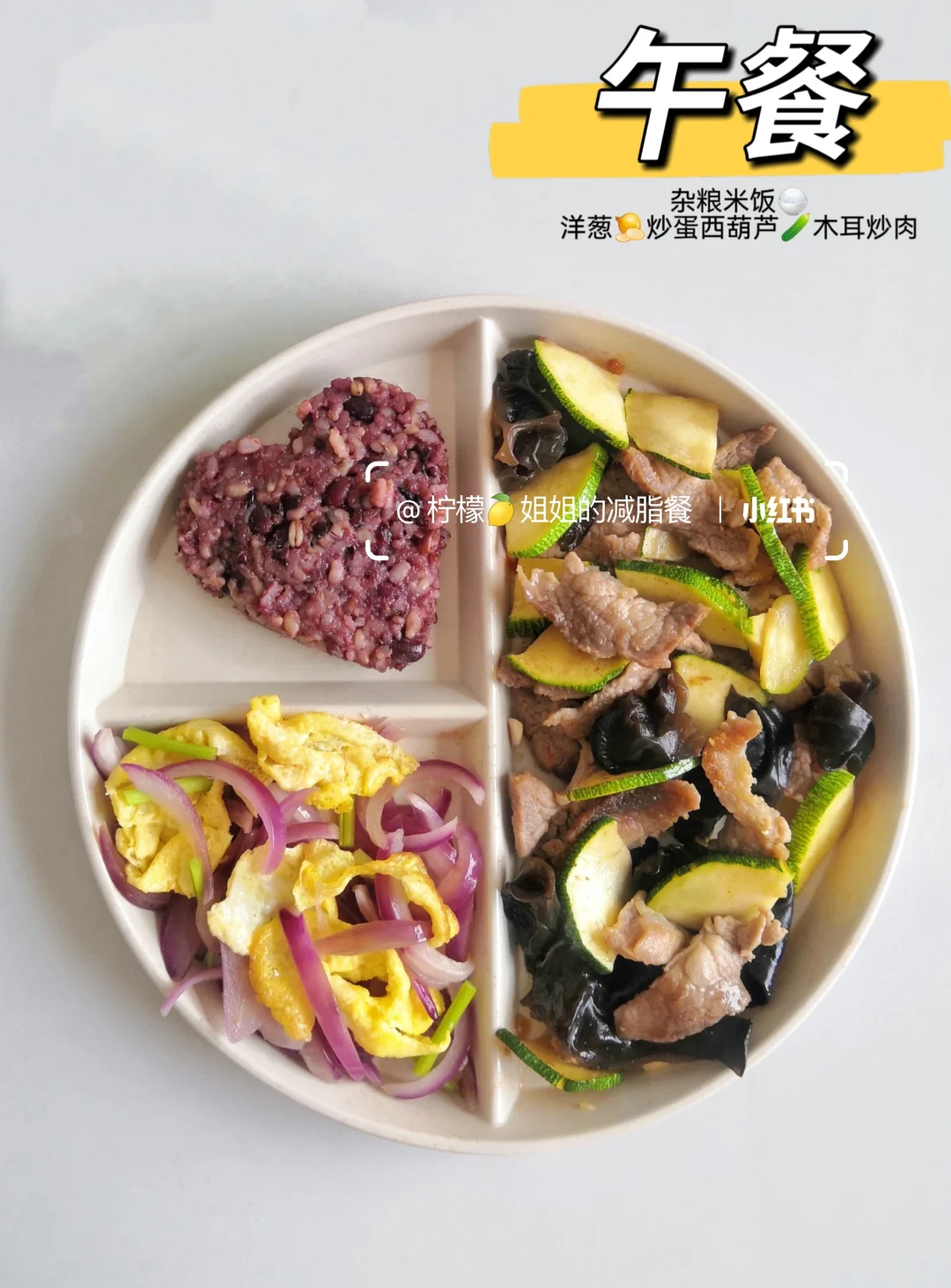 午餐⏱:杂粮米饭🍚,洋葱炒蛋,木耳西葫芦🥒炒肉