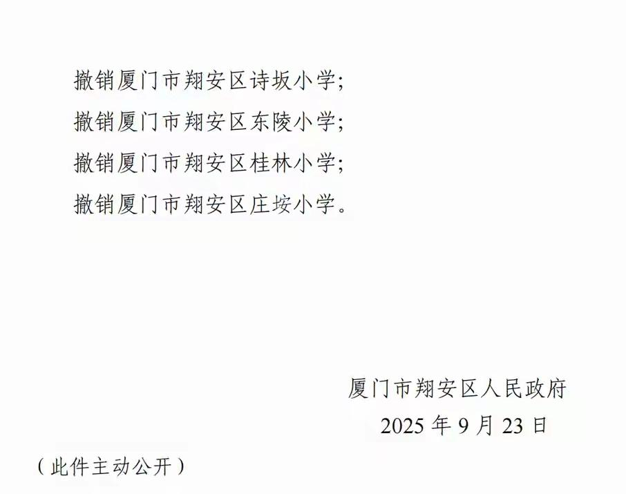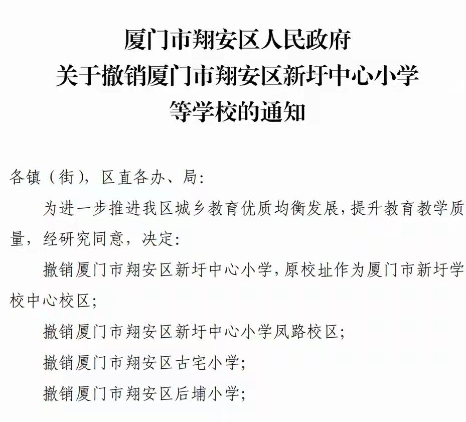 翔安撤销多所小学 根据翔安区公布的文件,翔安区撤销多所小学,来看看具体的有哪些?撤销的基本是原来的村小,可以说这些地方的孩子就读的新学校硬件得到极大改善。接下来片区内读的都是新的学校,硬件和师资都会得到极大的提改善。 撤销厦门市翔安区新圩中心小学,原校址作为厦门市新圩学校中心校区; 撤销厦门市翔安区新圩中心小学凤路校区; 撤销厦门市翔安区古宅小学; 撤销厦门市翔安区后埔小学; 撤销厦门市翔安区诗坂小学; 撤销厦门市翔安区东陵小学; 撤销厦门市翔安区桂林小学; 撤销厦门市翔安区庄垵小学。 申明:信息来源翔安教育局官网,本文无任何不良导向,具体信息以官方公布为准。