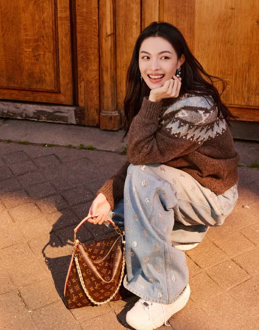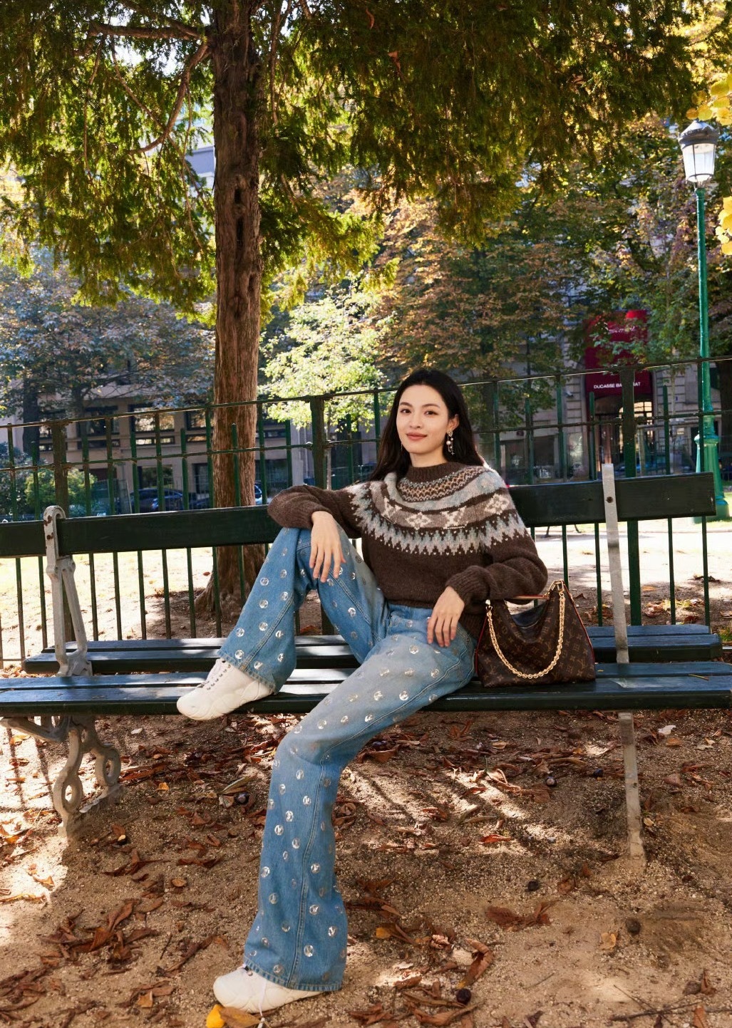 她选择了温暖的毛衣作为上装,棕色渐变配合几何图案的设计,复古又不失法式闲适。下搭的浅色阔腿牛仔裤印有低调的图案,宽松随意,呼应了毛衣的慵懒氛围。手上的 Louis Vuitton 包包点亮全身,带有一丝都市精致感,恰好平衡了毛衣与牛仔裤的随性。脚上的白色运动鞋增添了舒适与活力。
