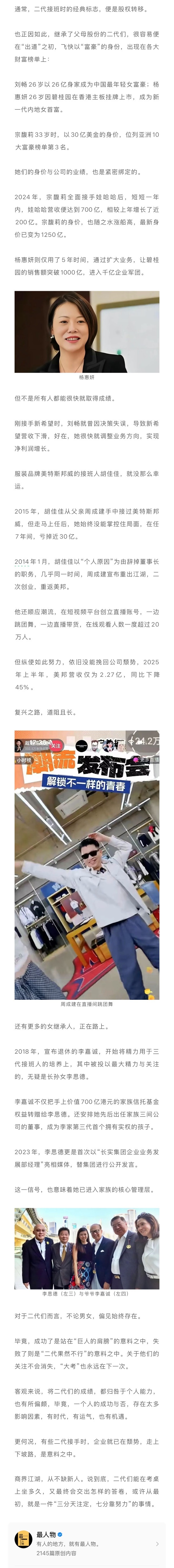 近两年,越来越多女继承人,出现在舆论场中,她们的人生路径大体相似:父母是创一代,高中或者大学就被送出国,毕业后回归家族企业,从基层做起,一步步完成继承之路。
