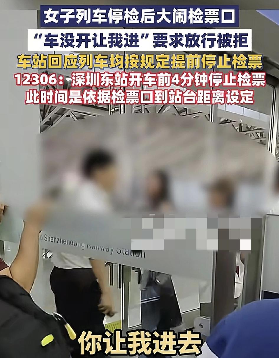 9月30日,广东深圳东站的女子在检票口大闹要求放行,女子的车票已经停止检票,工作人员称这都是有明文规定,列车开车前4分钟是停止检票,而这个时间也是检票口到站台的时间,该女子没有及时的赶到,同时女子还在等她两个朋友,整一列车的人不可能因为几个人而等待,发生了意外车站还要担责。选择高铁、火车飞机交通工具出行的朋友一定要时刻留意时间,提前到达车站,尤其是节假日要充分的留足时间。