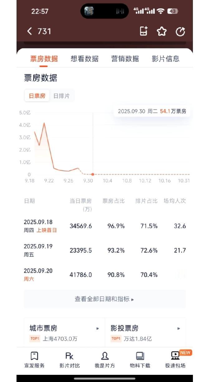 《731》电影票房终于破了15亿大关,制片方应该赚的盆满钵满了吧? 这部影片918当天上映,上映三天就录得近10亿的票房,也就是说,它上映三天,录得目前为止的总票房的2/3,后面10天是总票房的1/3。从票房走势图来看,票房几乎是一路下滑。这就有点奇怪了,上映前三天的票房完全称得上火爆甚至井喷,怎么后续就一蹶不振了呢? 难道真的如网上所说的,影片质量一般般?本来还想着趁国庆长假去看一下呢,现在都有点犹豫了!