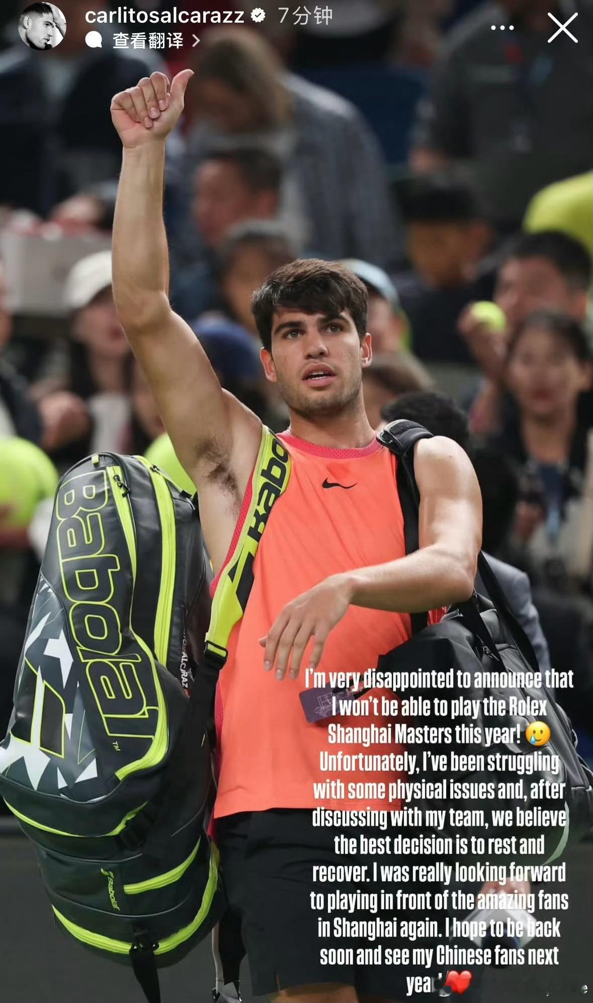 “我非常失望地宣布,我今年将无法参加上海劳力士大师赛!不幸的是,我一直受到一些身体问题的困扰。经过与团队讨论,我们认为最好的决定是休息和恢复。我真的很期待再次在上海出色的球迷面前比赛。我希望能尽快回来,明年见到我的中国球迷!”
