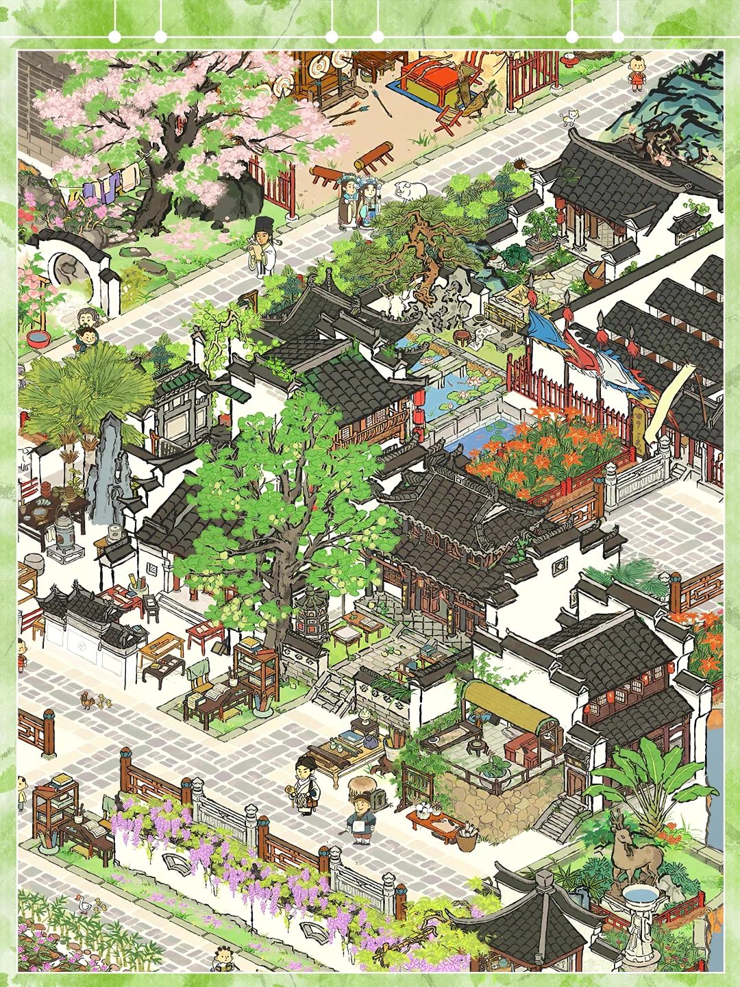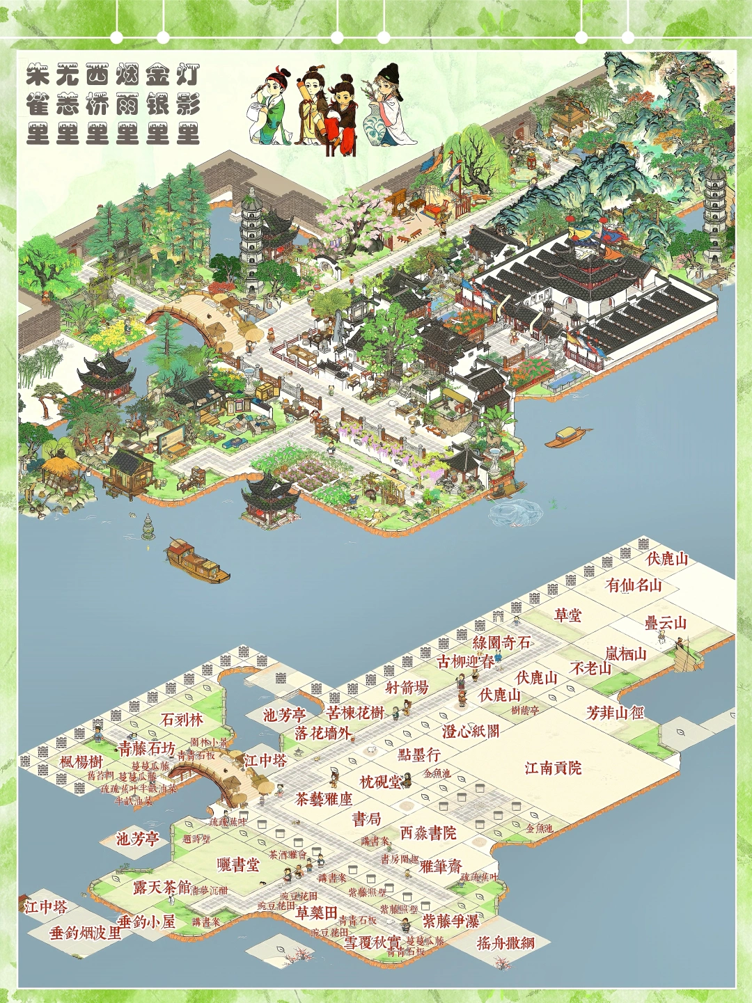 👉书院+书堂+书局+墨行+纸行+砚行+笔斋+贡院,一应俱全 👉地点:应天府江南贡院奇观区域 🌸建筑:西淼书院|书局|晒书堂|雅笔斋|枕砚堂|点墨行|澄心纸阁|露天茶馆|射箭场|紫藤争瀑|芳菲山径