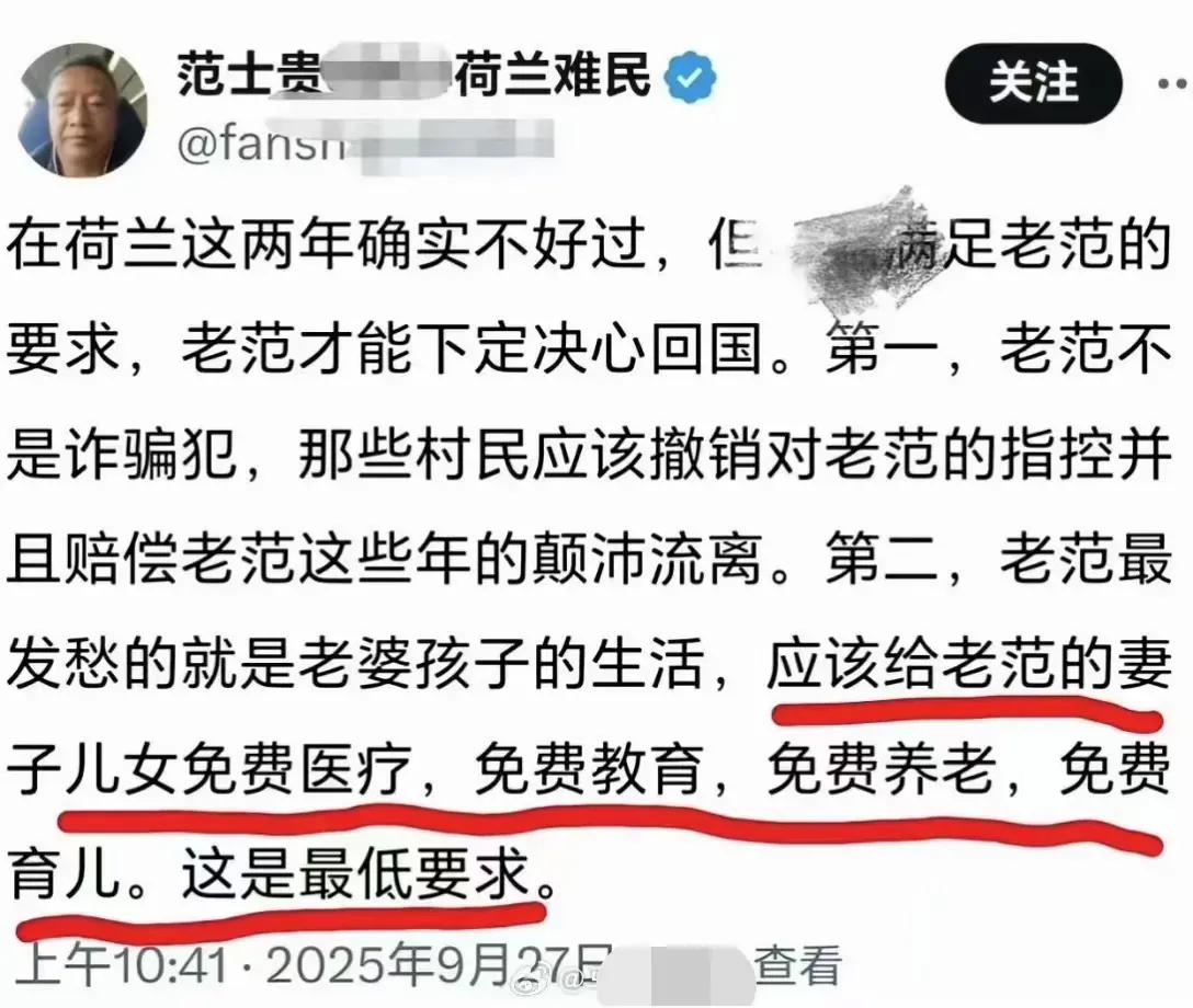 最近听说范世贵在荷兰混不下去了,想回国,还提了俩挺过分的条件。 第一个是让之前控诉他的村民撤案,还得赔他这些年在国外“流浪”的钱;第二个更离谱,要给他老婆孩子搞全免费的医疗、教育、养老和育儿。 这要求真是张口就来啊!咱普通人都没享过这么全的免费福利,他倒好,把回国当占便宜来了,纯属痴心妄想。 说真的,当初他自己选了出去,现在混不好才想起回国,还提这种不合理条件,谁能待见?咱们国家讲究互帮互助,但前提是得懂规矩、讲情理,不是谁想提条件就提条件的。 而且咱们向来欢迎真心为国家好、愿意回来贡献的人,但像他这样,当初没为家乡添过力,回来还想搞特殊化,肯定不被接受。这种只想着自己占便宜的心思,根本没把自己当咱这边的人,真把回国当“退路加福利站”了,想多了!