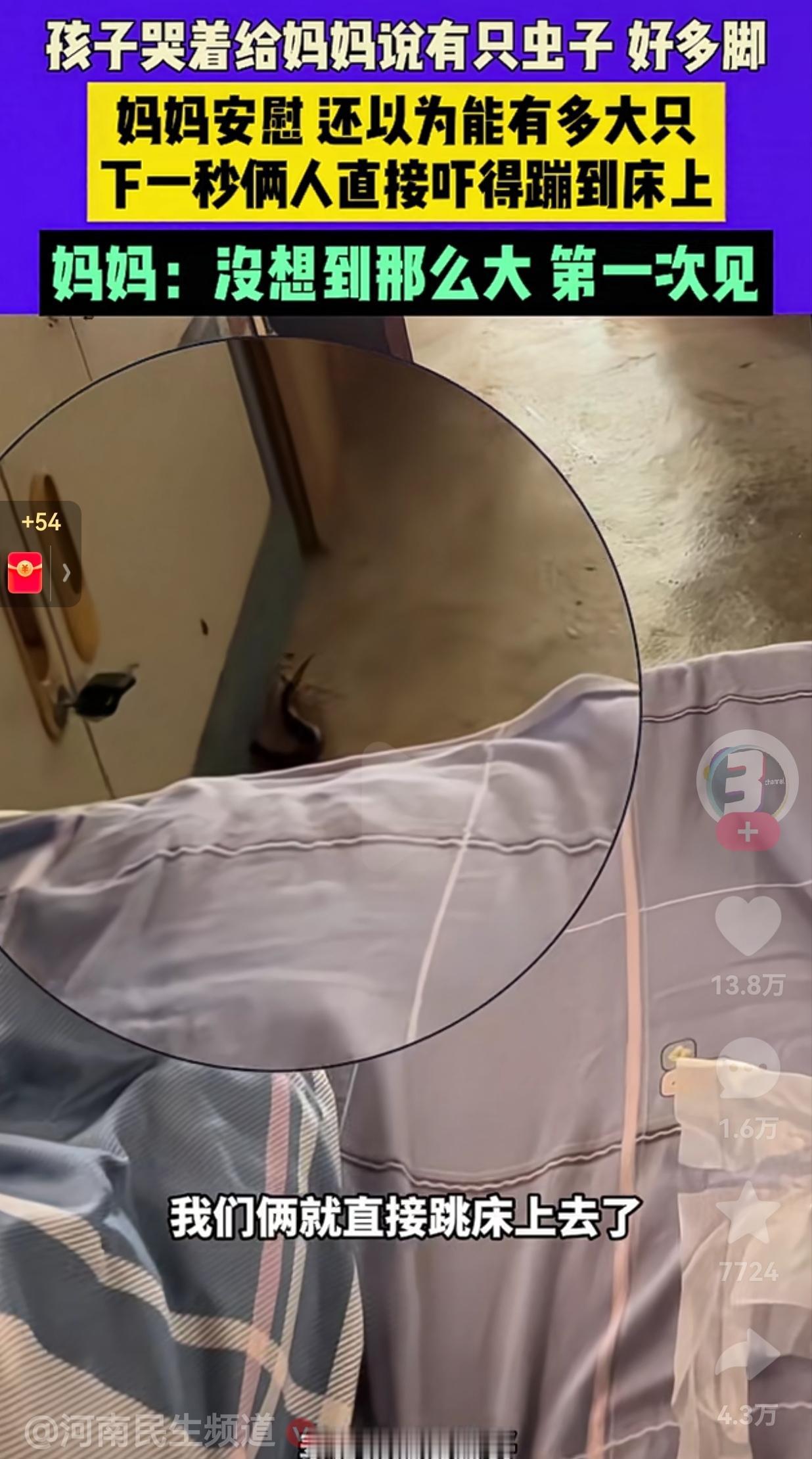这也太夸张了!孩子看到一只蜈蚣很害怕,就跟妈妈哭诉道,我刚刚看到了一只虫子,有好多只脚。看得出来,孩子是真的害怕边说边哭了起来。 妈妈看到孩子被吓哭了,还有点幸灾乐祸呢?妈妈心想:“不就是一个虫子吗?有什么好怕的呢?” 结果,下一秒虫子就出现了,孩子指着虫子对妈妈说:“你看,虫子就在那里。” 妈妈看到这么大的蜈蚣,也不淡定了!感觉吓破了胆子,两个人吓得大喊大叫,直接上了床。 等到蜈蚣走了之后,两人的情绪才稍稍缓和。 网友看到后评论说,本来以为小孩哥已经够夸张的了,直到妈妈那一声我知道我草率了。 还有的网友说,女子本弱,为母则刚,这妈妈在关键的时刻也吓的哇哇大叫,不就是一只蜈蚣嘛!拿打火机烧,它就死了,这都不是事儿。 如果你遇到这种情况,你会怎么办呢?欢迎大家评论区讨论留言。