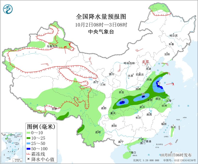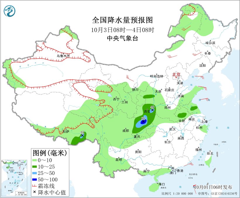 图4全国降水量预报图(10月2日08时-3日08时)