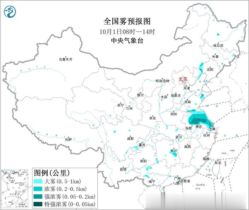 预计,10月1日早晨至上午,山东西南部和东部、江苏、安徽东北部、上海、湖南中部、辽宁西部等地的部分地区有大雾,局地有能见度低于200米的强浓雾。中央气象台10月1日06时继续发布大雾黄色预警。