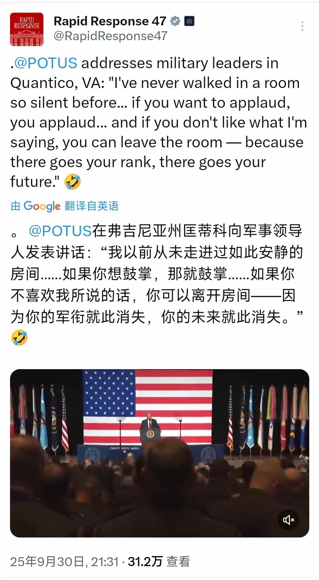 9月30日,Rapid Response 47(注)写道:特朗普召集全军将领们在弗吉尼亚州匡蒂科发表讲话:“我以前从未走进过如此安静的房间……如果你想鼓掌,那就鼓掌……如果你不喜欢我所说的话,你可以离开房间——因为你的军衔就此消失,你的未来就此消失。” 看到吗,这是特朗普对待美国将军们的态度,他用威胁的方式向这群准将以上的将军们要鼓掌。他太喜欢掌声啦。可是这群还没有从不明白为什么被召集到一起的疑问中找到答案,还处于懵瞪状态的将军们绝没想过特朗普把他们当成他的粉丝,完全没有把他们当成将军看待,并用威胁的口吻向他们要山呼海啸风掌声。这是美国总统特朗普对美国的将军们的公然羞辱和镇压。世所罕见。 受到羞辱的美国将军们为了“军衔”和“未来”不消失敢怒不敢言,只能用拒绝鼓掌、“安静”和只用眼睛看着他的方式表达内心的愤怒。这一刻,美国总统和美国的将军们形成了对峙。世所罕见。 而Rapid Response 47这样写的目的大概只有一个,那就是赞美特朗普在美国将军们面前的独裁和飞扬跋扈,并唯恐无人不知无人不晓。世所罕见。 特朗普霸道了极点,而美国将军们委屈到了极点的这一幕,让人瞠目结舌。(注:“Rapid Response 47”是白宫的社交媒体账号)