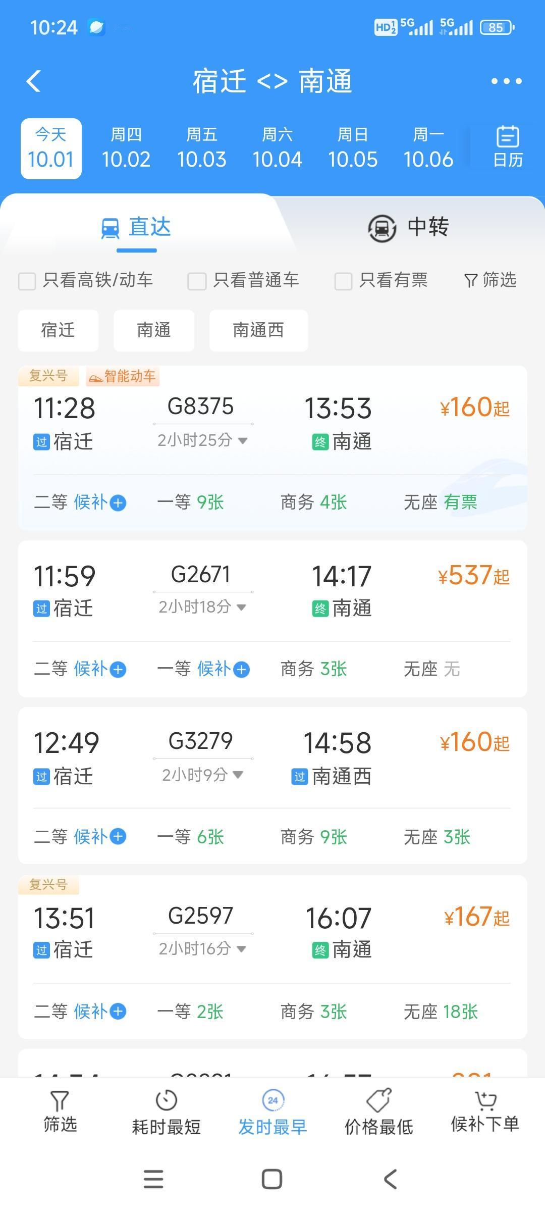 南通到宿迁400公里,坐高铁又快又方便。今天南通到宿迁一片难求,全部卖完,连站票都卖完了。反而,今天的宿迁到南通还有站票卖。