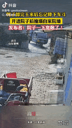 “真是个人才!”山东德州,一男子卸完玉米骑三轮车回家,进院子时院墙突然塌了!他赶