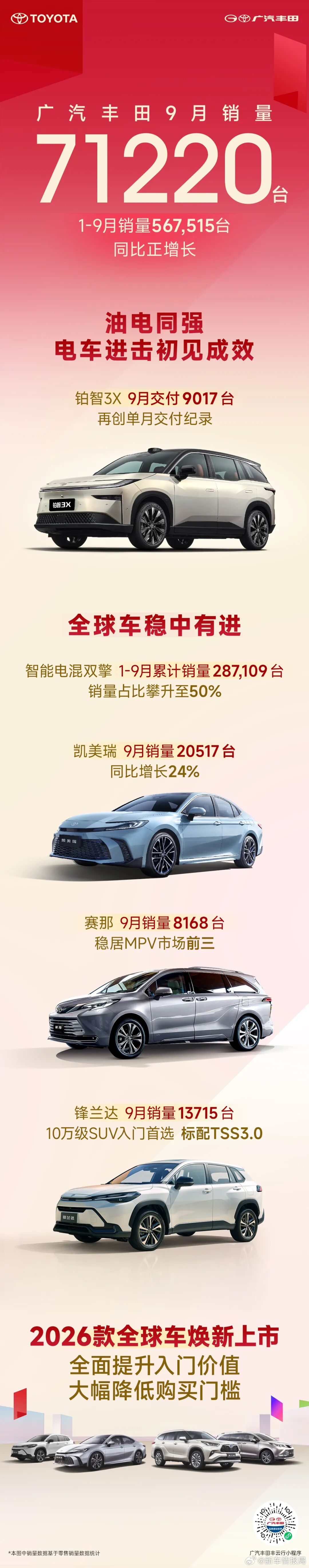 广汽丰田9月销量71220台 刚刚公布了9月销量成绩,广汽丰田9月共销售71220台,其中铂智3X车型9月交付9017台,再创单月交付纪录;1-9月销量567515台,同比正增长。新车情报局
