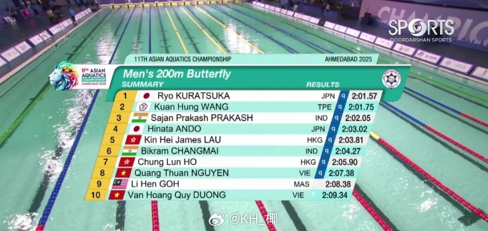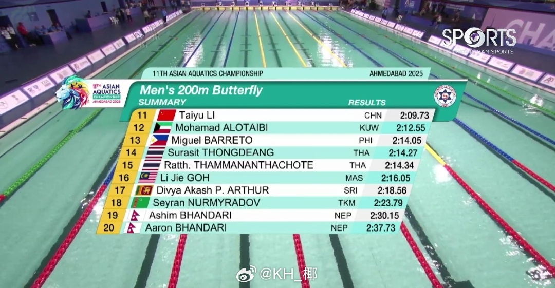 亚洲游泳锦标赛男200蝶预赛李泰裕2:09.73第11无缘决赛