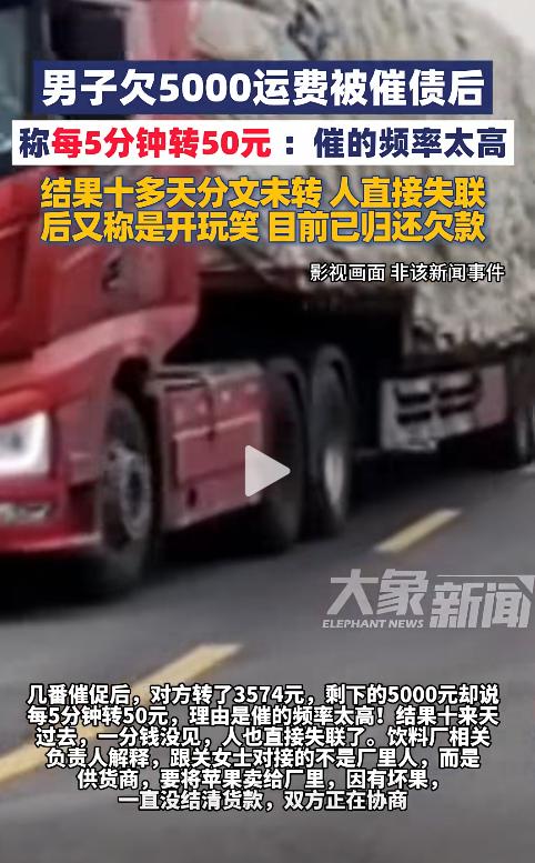 伤害性不大,侮辱性极强!河南安阳,男子为了尽快把苹果从四川凉山送到目的地,他和妻子两天两夜没合眼。不曾想,苹果完好的运达后,老板却迟迟不给结运费。几经催促,老板嫌男子太烦人,就支付了3574元,剩下的5000元却要“分期支付”,表示每5分钟给他50元。虽然这样的支付方式有点侮辱人,但男子还是勉强接受。结果,十多天过去了,男子一分钱没收到,老板还玩起了消失。 9月28日,大象新闻的一个报道,引发了很多人的讨论。 “催什么催,剩下的尾款我每5分钟转你50块!”这不是一句玩笑话,而是真实发生在关女士和她丈夫身上的一件事。 光女士和丈夫常年开着一辆重卡,在全国各地奔波运货。两个人既是夫妻,也是工作上的最佳搭档,生活虽然辛苦,但靠着这份跑车的营生,他们一家人的日子也算过得稳当。 前几天,他们正好刚从一趟长途回来,想着休整两天,好好在家陪陪孩子,就在这时,物流公司突然打来电话,说有一批急单,要把凉山的苹果连夜运到几百公里外的一家饮料厂。 对方开出的条件是必须在规定时间内送达,否则就算是违约。 一听是“急单”,光女士和丈夫最初是拒绝的,因为急单意味着行程紧张,休息时间被压缩,风险比平时大得多,而且山路多、天气也不好,一不小心就可能出事。 可当他们听到价格时,心里还是动摇了。这一趟单子的运费,比平时同样距离的单子要高出三分之一。 丈夫皱着眉头想了很久,说道:“虽然辛苦点,但接下这一单,等我们回来,房贷压力也能轻点。” 光女士也沉默了片刻,想到孩子下个月要交的学费,还是点了点头:“那就接吧,咱们小心点开。” 就这样,他们重新收拾好行李,把车加满油,一路奔赴凉山。 当他们抵达果园时,夜色已经降临,光女士和丈夫站在车边,看着货物一点点被装满,心里既有一丝满足,也带着些许紧张,这趟路不好走。 为了赶上时限,把苹果准时从四川凉山送到饮料厂,光女士和丈夫几乎拼尽了全力,那一路山路蜿蜒,夜里又常有大雾,他们轮流握着方向盘,眼皮沉得像灌了铅,但谁都不敢松懈。 丈夫一遍遍用冷水洗脸提神,光女士则端着保温杯里的浓茶,不停给丈夫递过来,就这样,他们硬是咬牙撑了两天两夜,几乎没合眼。 当货车稳稳停在厂区,满车苹果一筐筐卸下,夫妻俩长舒了一口气。那一刻,他们觉得所有的辛苦都值了。 可谁曾想,货虽送到了,钱却迟迟拿不到,起初他们以为只是财务流程问题,耐心地等了几天。可当丈夫再次打电话催问时,老板却语气冷淡,推三阻四。 “你们这点钱催什么催?不急。”老板口气敷衍。 丈夫心里窝火,忍着气再次说明:“我们连夜赶路,油费、过路费都先垫着的,家里还等着用钱,能不能尽快结清?” 没想到,对方竟嫌他烦,冷笑一声:“行,我先给你3574元,剩下的5000元,分期给你。以后每5分钟打50元过去,直到打完为止。”这么做的原因是催的频率太高! 光女士听到这话一时间愣住了,想了想就这样吧,只要愿意给就行,但是一连几天过去了,尾款却迟迟没有打过去,之后人直接失联了! 饮料厂相关负责人解释,跟关女士对接的不是广里人,而是供货商,要将苹果卖给厂里,因有坏果,一直没结清货款,双方正在协商。 在工厂负责人和记者的帮忙下,这笔迟到的辛苦钱才总算要了回来。 有人说:养大车的多难啊,这些人真是太不地道了。 信息来源:大象新闻