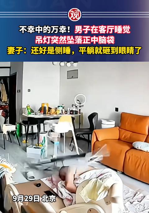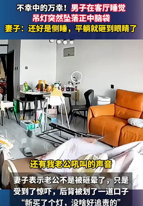 担心的事还是发生了!近日北京,一女子在卧室里睡觉时,突然听到外面有巨响,就立即出去查看情况,结果眼前的一幕却把她给惊呆了,竟是天花板上的灯具砸了下来,而她的丈夫,刚好躺在灯具的正下方! 那天中午,阳光透过客厅的窗帘洒进来,暖洋洋的,王女士(化名)和丈夫吃完午饭后,稍微收拾了一下餐桌,把碗筷洗净,厨房也整理得整整齐齐。 屋子里弥漫着饭后的余香,空气里带着一丝慵懒的温暖。 “我先去休息一会,你也歇一会吧。”丈夫揉了揉太阳穴,王女士说:“我还有一点工作没做完,先去忙会儿。” 说完,她走向卧室,轻轻关上门,留下一缕轻微的咔嗒声,卧室里,她打开电脑,把文件一条条翻阅、处理,偶尔在笔记本上写下几行重要的记录,专注的神情让人不敢打扰。 而丈夫则一个人躺在客厅的地板上,双手枕在脑后,望着天花板出神,地板略带凉意,却让他觉得舒适,仿佛能把身体完全放松下来。 不知不觉间,客厅里的空气逐渐安静下来。丈夫躺在地板上,呼吸平稳,慢慢进入了沉沉的睡眠。王女士则仍埋头在卧室的桌子前,专注地敲打着键盘,处理着一份又一份文件。 午后的阳光透过窗帘洒在地板上,映出斑驳的光影,整个房间静谧而祥和,仿佛时间都慢了下来。 可就在这片宁静中,一声巨响骤然打破了平静。伴随着“砰”的一声,王女士被这一声吓得猛地抬起头,心跳几乎要跳出胸口,手中的笔差点从指间滑落。 她冲出卧室,只见客厅里灯具重重地砸在地上,碎片散落一地,丈夫正好侧躺在灯具掉落的位置上,脸朝向一边,惊魂未定,却意外地安然无恙。 王女士心里一阵悬着的石头终于落地,冲上前查看他的情况。 丈夫的脸没有划伤,表情有些迷茫,手脚微微抖着,后背上却出现了一道细长的划痕,但是不严重,整理完现场后,他们不得不面对现实,天花板的灯具再也不能再用。 找来维修工人检查后,诊断书也写得简单粗暴:固定螺丝老化松动,长期没人管,造成了这次意外,工作人员耸耸肩:“这种东西没必要追究,以后多注意点就行。” 信息来源:观察者网