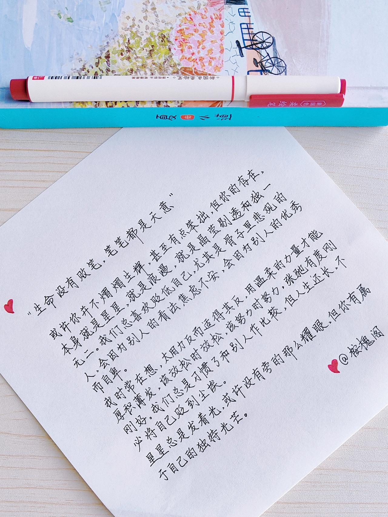 抄书练字打卡011次[礼花] 或许你并不是熠熠生辉,甚至有点笨拙,但你的存在,本身就是星星,就是浪漫,就是晶莹剔透和独一无二。 我们总喜欢贬低自己,尤其是骨子里悲观的人,会因为别人的看法焦虑不安,会因为别人的优秀而自卑。 我时常在想,太用力反而适得其反,用温柔的力量才能厚积薄发,该放松时放松,该努力时努力,张弛有度刚刚好。 我们总是习惯了和别人作比较,但人生还长,不必将自己贬到尘埃。星星总是发光的,或许没有旁的那么耀眼,但你有属于自己的光芒。 [烟花]“生命没有败笔,笔笔都是天意。” 挑战31天练字打卡