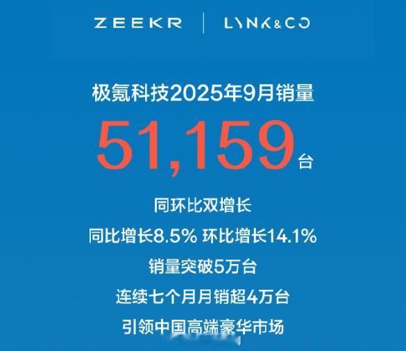 极氪科技 9月一共交付了 51,159台 车,同比增长8.5%,这已经是连续第7个月月交付量保持在4万台以上了