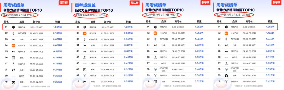 零跑双喜盈门,9月交付创新高,月销、周销双双破纪录! 月初,各大车企的9月销