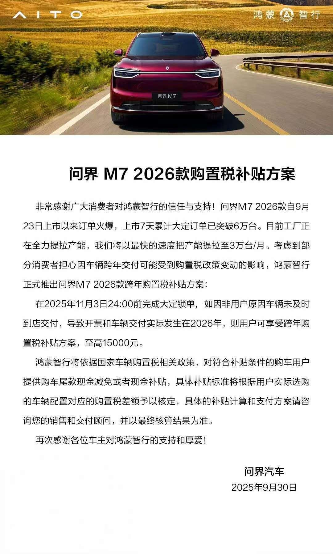 但问界针对这一情况推出了购置税补贴,只要是11月3日前大定锁单的,跨年交付可享1.5万元购置税补贴。[666]