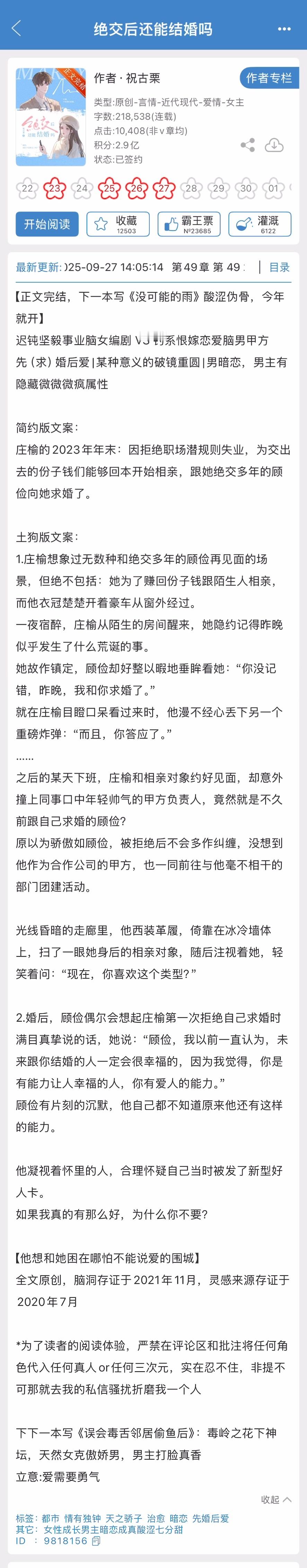 祝古栗(法拉栗)的《绝交后还能结婚吗》完结啦!现言,先婚后爱➕某种意义上的破镜重圆➕男暗恋,迟钝坚毅事业脑女编剧x钓系恨嫁恋爱脑男甲方[开学季]