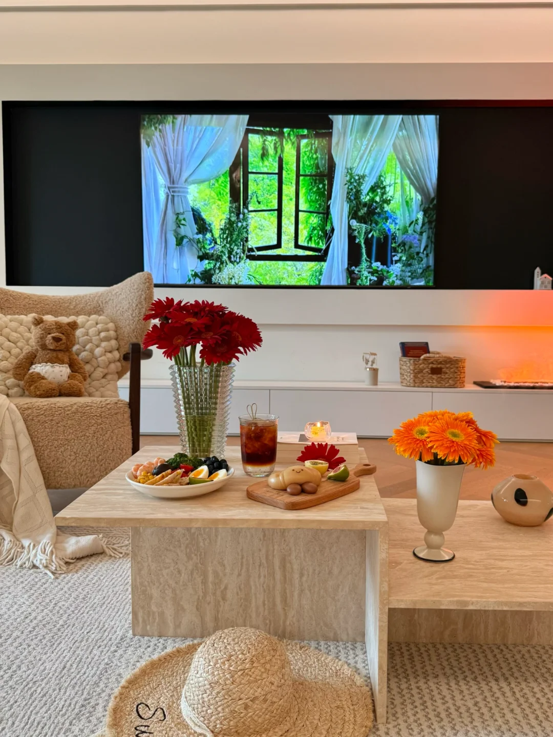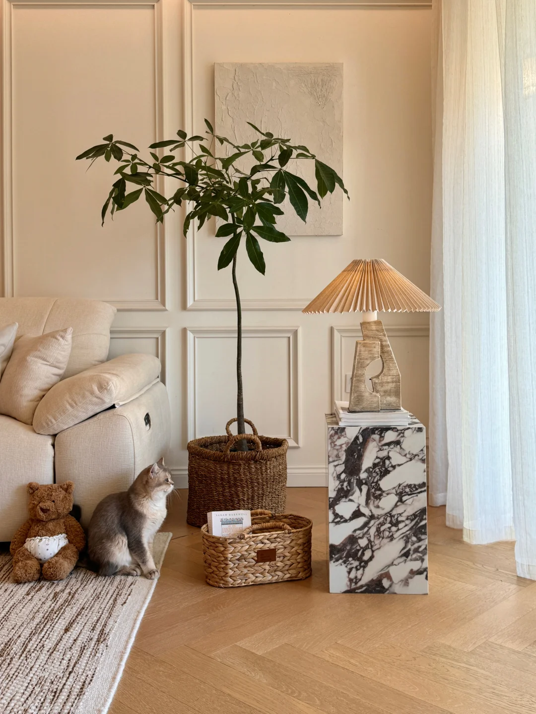 🔆最后加点小细节提气质,沙发旁边放一盏vintage中古台灯,晚上只开这盏灯,暖光映在墙上,连影子都透着温柔。茶几跟ins博主选择的洞石材质,很北欧!