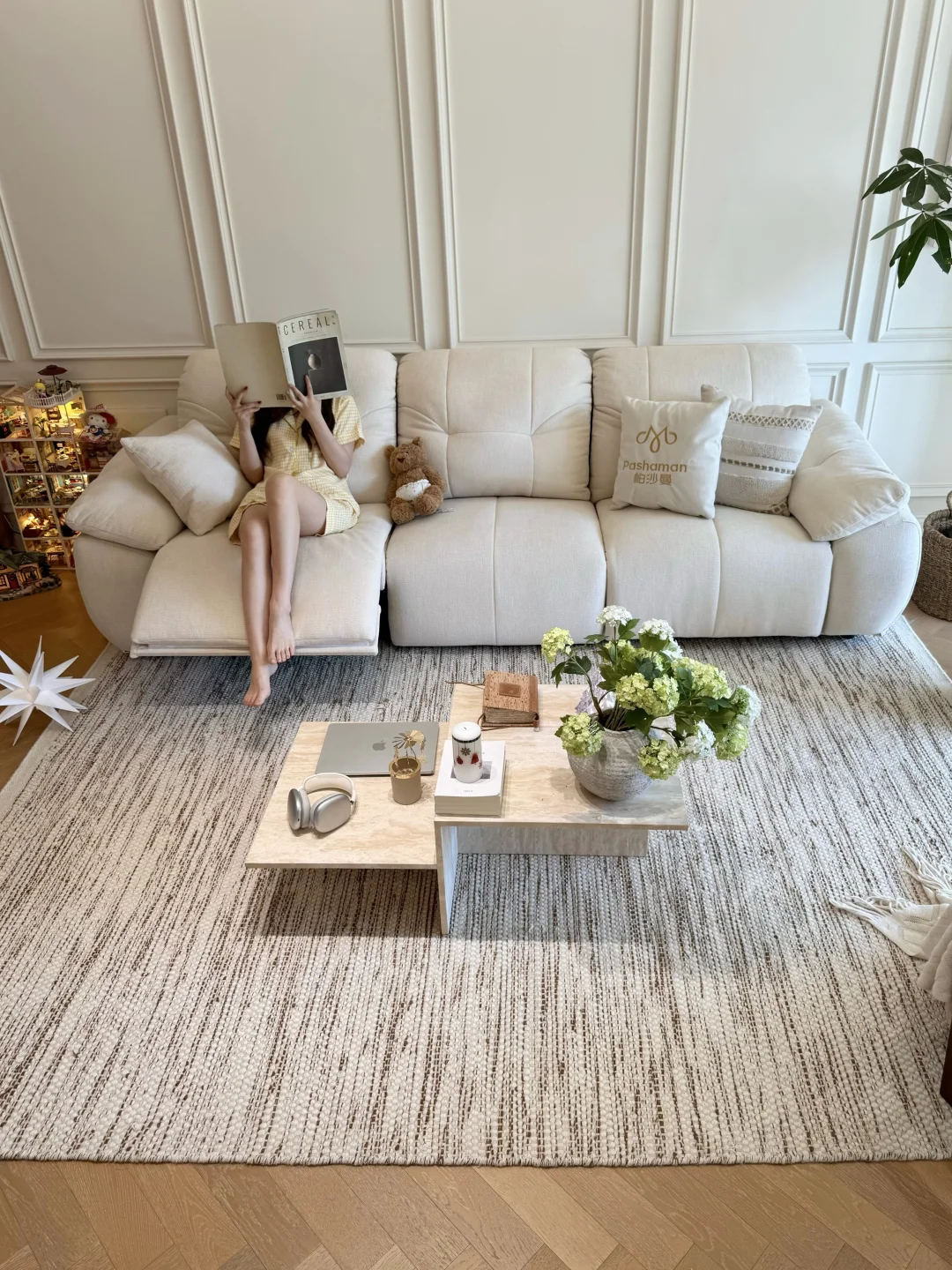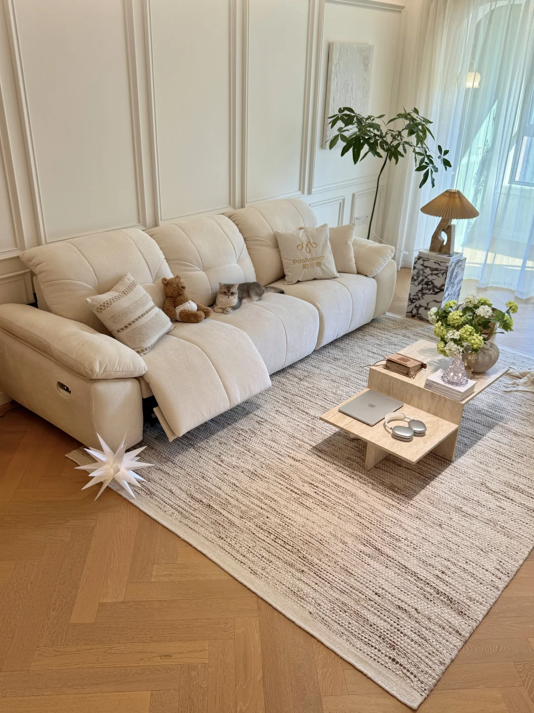 🔆软装才是让客厅有灵魂的关键。全屋通铺木地板,上面放块手编羊毛地毯,选米白色带点浅咖色纹理的,脚踩上去软乎乎的,还不容易显脏,平时坐在地毯上追剧、拼乐高都舒服。
