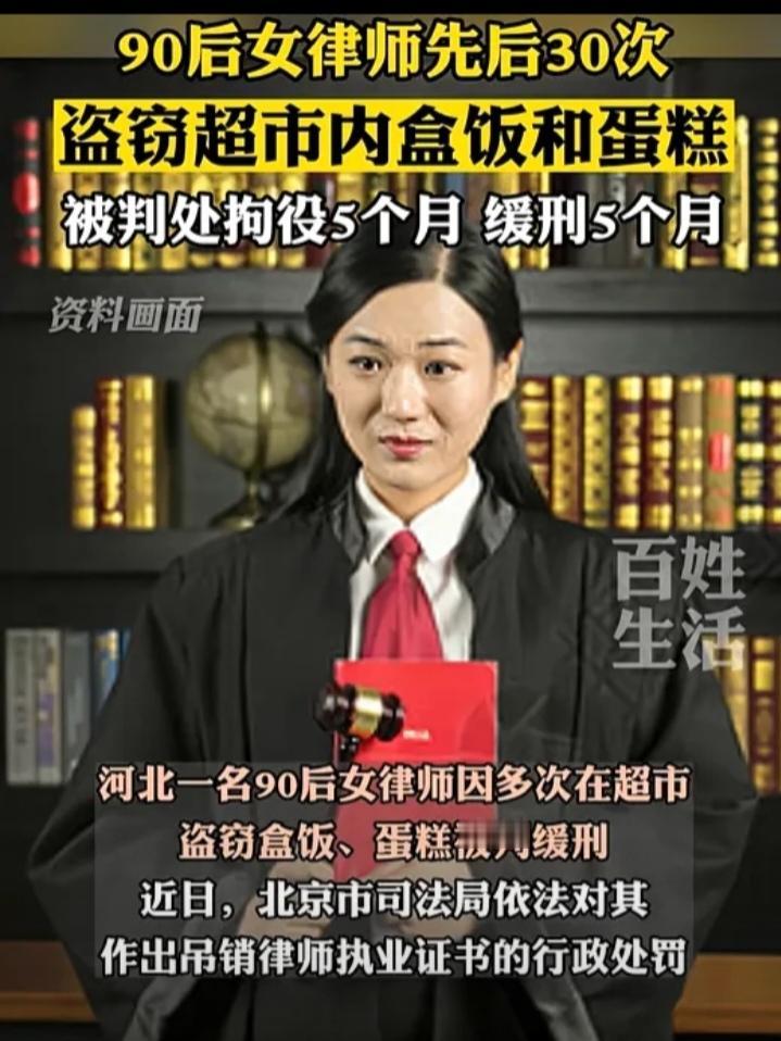 “知法犯法,罪加一等!”北京一90后女律师,为了贪小便宜,竟然利用自主结账设备,以不结账、少结账的方式,先后30余次盗窃超市盒饭、蛋糕等商品,共价值1800余元,可纸终究包不住火,她被抓后送上了法庭,法院判了! 律师应该是熟知法律的,可她却放着好好的律师工作不干,偏要去超市“蹭”东西,最后不仅蹲了局子,连吃饭的家伙——律师执照都给吊销了。 女的叫刘某,在北京一家律所上班,天天跟法律条文打交道,按说最清楚犯法的后果,可她偏偏揣着明白装糊涂,干起了偷鸡摸狗的事。 她每次去超市买完东西,专挑自助结账机跟前凑,自助机没人盯着,少扫一件、不扫一件,超市未必能发现。”就这么着,她要么故意不扫码直接拎走,要么扫了两三件,藏起四五件只结一部分钱,偷偷摸摸干了30多次,加起来偷了1800多块钱的东西。 一开始她还挺得意,觉得自己“聪明”,可没藏多久,超市查监控就发现了不对劲——怎么总有人结的账和拿的东西对不上?一查到底,就把刘某给揪了出来。 被抓的时候,刘某之前的侥幸心理全没了,只剩下慌。她知道自己是律师,后果比普通人严重得多,所以赶紧主动赔偿超市损失,还求着超市出了谅解书,盼着能从轻处理。 法院最终认定她盗窃罪没跑,判了她拘役5个月,缓刑5个月,罚了3000块钱。这还不算完,司法局直接把她的律师执业证吊销了——意思就是,以后她再也不能当律师,这辈子都别想碰这个行业了。 这事儿一出来,大家都炸了锅。一个天天帮别人打官司、维护法律正义的律师,自己却知法犯法,这简直是天大的讽刺。很多人都说,她这哪是贪小便宜,分明是职业道德和法律底线都丢了。律师这个职业,最讲究的就是诚信和公正,她连超市的盒饭都要偷,怎么可能在法庭上为当事人争取公平?所以,吊销执照真是一点都不冤,这是自毁前程,也是给所有法律从业者敲了个警钟。 各位读者你们怎么看?欢迎在评论区讨论。