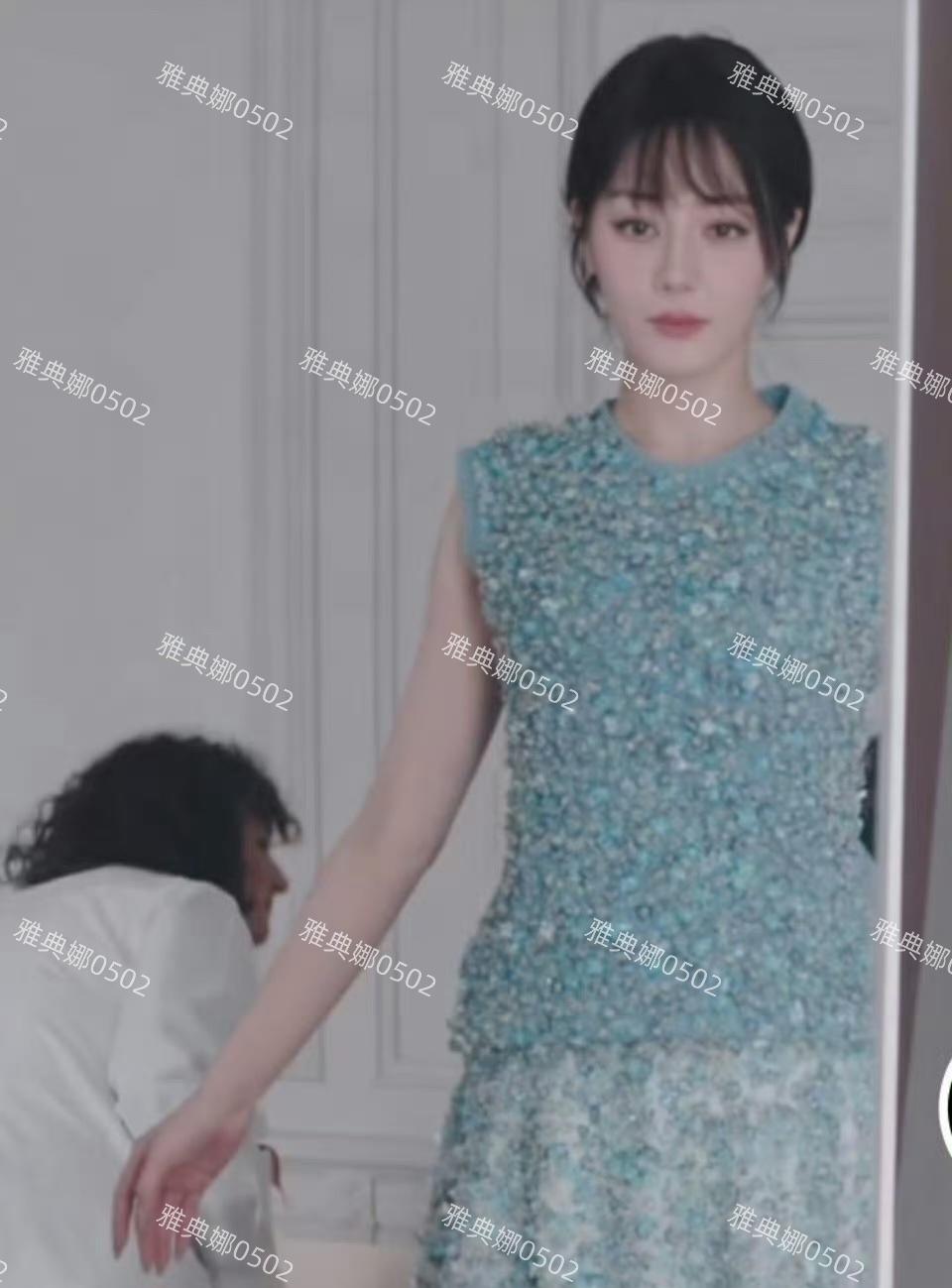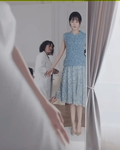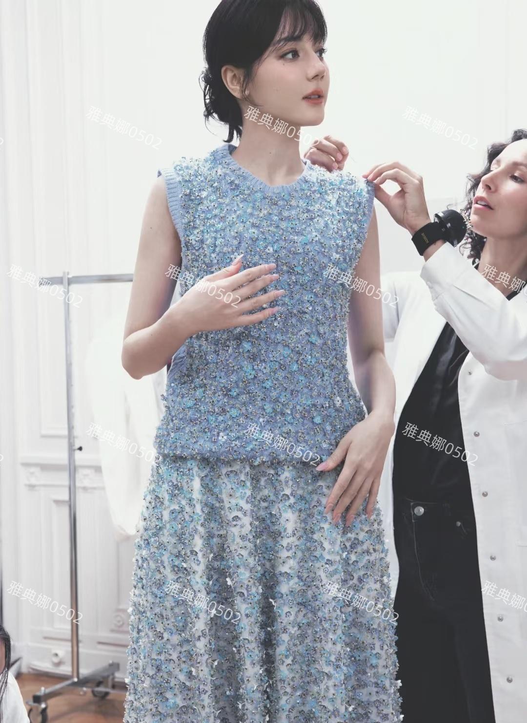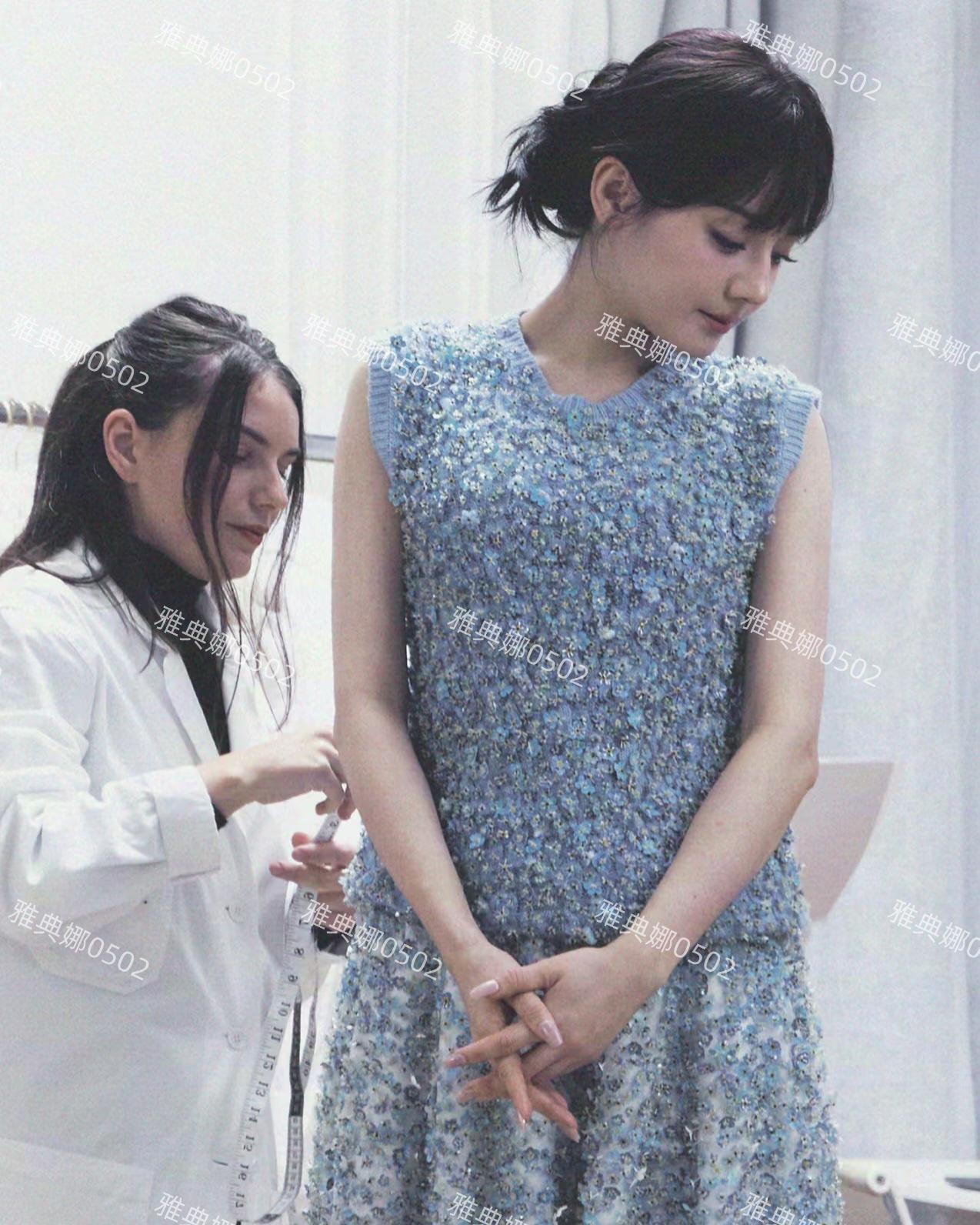 迪丽热巴迪奥大秀前的试妆照! 33岁的她还是如此清纯美好,像一个要为参加毕业舞会选礼服紧张又羞涩的小女孩,低头侧目小心翼翼的看向镜中的自己! 身边的设计师和裁缝不停的在她身边忙碌着,她身上这套海洋蓝色的针织套裙上镶满了亮片和小蝴蝶,重工感很强十分复古奢华。 不得不说热巴的鼻子太好看了,高挺立体把五官衬得深邃浓郁富有油画感,镜子中的她更是像小公主一样美的十分梦幻!