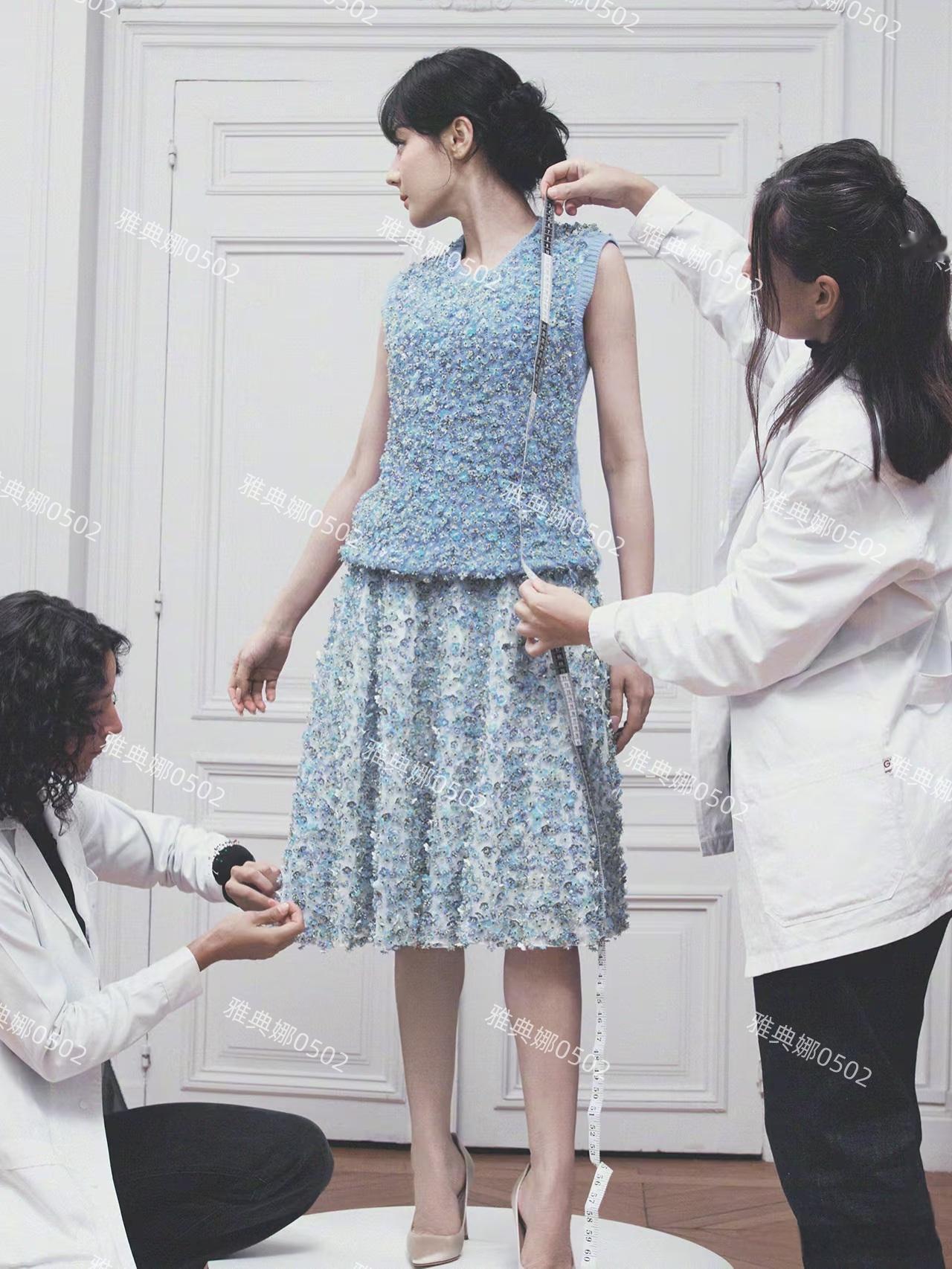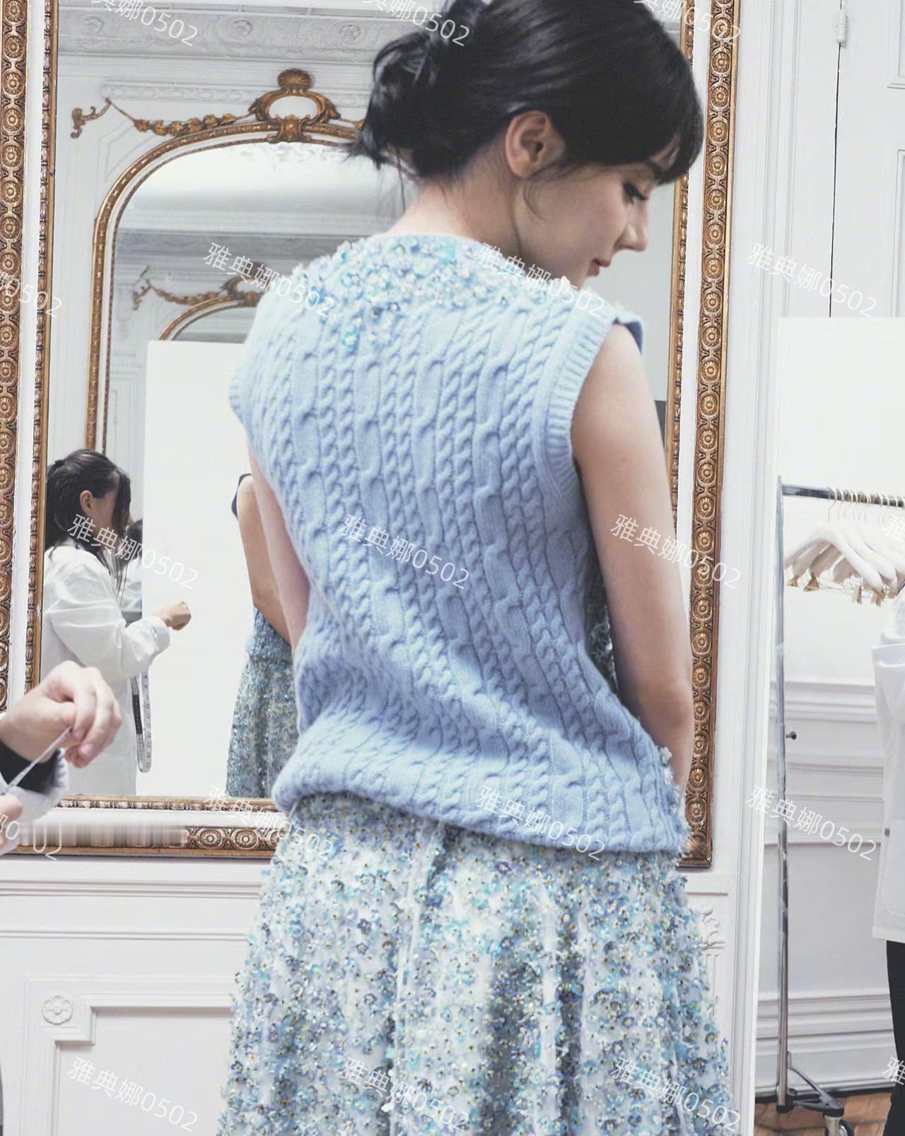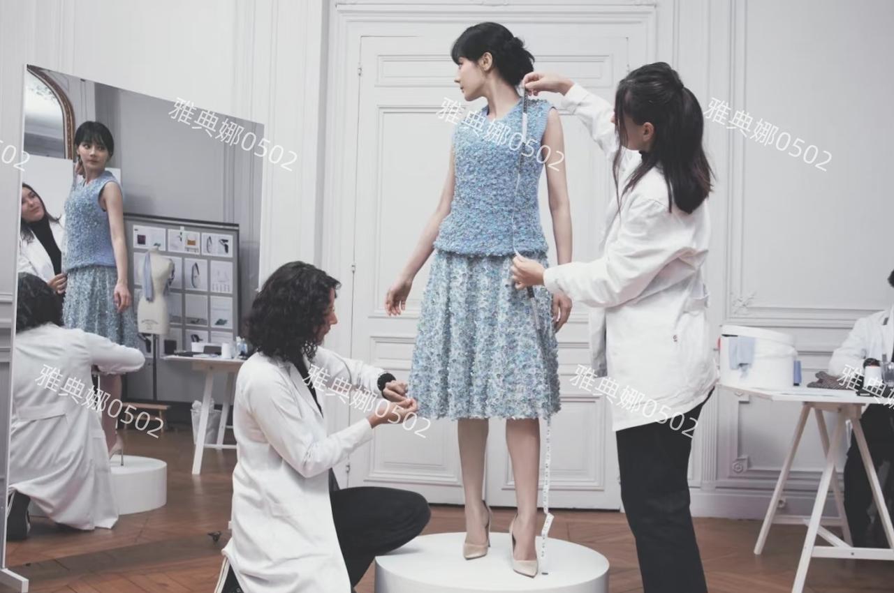 迪丽热巴迪奥大秀前的试妆照! 33岁的她还是如此清纯美好,像一个要为参加毕业舞会选礼服紧张又羞涩的小女孩,低头侧目小心翼翼的看向镜中的自己! 身边的设计师和裁缝不停的在她身边忙碌着,她身上这套海洋蓝色的针织套裙上镶满了亮片和小蝴蝶,重工感很强十分复古奢华。 不得不说热巴的鼻子太好看了,高挺立体把五官衬得深邃浓郁富有油画感,镜子中的她更是像小公主一样美的十分梦幻!