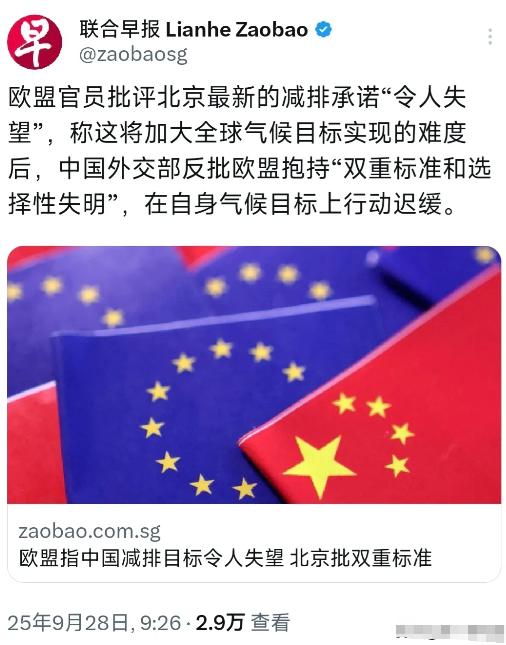 新加坡联合早报9月28日报道:“欧盟官员批评北京最新的减排承诺‘令人失望’,称这将加大全球气候目标实现的难度后,中国外交部反批欧盟抱持‘双重标准和选择性失明’,在自身气候目标上行动迟缓。” 这场隔空交锋看着是气候议题之争,实则早埋着伏笔。毕竟中欧作为全球气候治理的两大支柱,立场差异从来都没藏严实过。欧盟一直端着“气候引领者”的架子,总爱用自己的标准丈量别人。 但欧盟自己的日子过得并不体面。联合国气变峰会刚结束没几天,120个国家都公布了新的减排目标,欧盟却因为内部内讧迟迟没敲定最终方案。他们立法机构只敢先放个风声,说2035年要在1990年基础上减排66%到72%,还得等COP30开会才能最终拍板。 更打脸的是欧盟委员会主席冯德莱恩的操作。今年8月,她为了和美国谈贸易,居然承诺要在特朗普任期结束前买7500亿美元的美国燃料。明眼人都看得出来,这玩意儿根本落不了地,但光这承诺就足够拖累欧洲的可再生能源转型进程。 一边对别人的承诺挑三拣四,一边自己在转型路上打退堂鼓,这双重标准玩得确实溜。中国这边可没闲着,这些年在气候领域的投入肉眼可见。中国现在是全球最大的清洁能源技术生产国和应用国,手里攥着六成以上的绿色技术,从太阳能板到风电设备,从电动车电池到高铁系统,全产业链都能拿得出手。 植树造林方面中国更是下了血本,大气和水污染防治的成效连联合国都认可。这次就算欧盟觉得减排力度不够,中国也是首次亮出了绝对量减排目标,这份诚意不该被无视。 欧盟的指责里还藏着别的心思。这两年中国新能源产业发展太快,欧盟企业有点慌了神。他们一边担心自己的市场份额被抢,一边就想拿“减排”当幌子搞保护主义。前段时间欧盟还琢磨着对中国电动汽车征收关税,说白了就是怕竞争不过。 有意思的是,欧盟自己的补贴力度大得惊人。2021到2030年这十年里,他们计划拿出超过1.44万亿欧元搞产业补贴,截至2024年就已经发了3000多亿欧元。他们还出台一堆经贸“工具箱”,明着暗着优先扶持欧洲企业,这时候倒不提“市场公平”了。 中国外交部的反击戳中了要害:欧盟与其盯着别人的承诺,不如先管好自己的行动。欧洲汽车制造商协会最近都急了,因为2025年碳排放新规要生效,新车每公里排放量得从116克降到93.6克,不少企业压根没准备好,只能呼吁欧盟提前审查法规、给点缓冲期。 自己的汽车业转型都卡着壳,还有空对别人指手画脚,这逻辑确实让人费解。更讽刺的是,中欧建交50周年刚过,双方刚在7月达成应对气候变化的联合声明,转头就因为减排承诺起了争执。 那份声明本来挺有意义,在全球单边主义抬头的时候,至少说明气候合作还有希望。现在欧盟这波指责,差点把好不容易建立的共识给搅黄了。联合国前高官都站出来说,碎片化的世界里,中欧气候合作既可行又必要,这时候闹矛盾纯属内耗。 中国驻欧盟使团团长蔡润大使之前也提过,中欧企业在绿色领域的合作早就落地了,欧洲的光伏电站、风电项目里,到处都有中国技术的影子,冰岛的地热项目也是双方联手搞的。这些实打实的合作,比空泛的指责有意义多了。 说到底,气候变化是全人类的敌人,不是用来互相攻击的武器。欧盟要是真为全球气候目标着想,就该放下双重标准,和中国好好谈技术标准、聊补贴规则,而不是动辄拿承诺说事儿。中国也愿意在合作中提升减排力度,但这种提升得建立在公平对话的基础上,不能被道德绑架。 11月巴西COP30大会就要开了,到时候中欧还得坐在一张桌子上谈。要是现在把关系搞僵,受影响的是全球的气候治理进程。毕竟光靠一方努力没用,中国的产能优势和欧洲的技术、资金优势结合起来,才能真正推动绿色转型。 欧盟该明白,指责解决不了问题。与其对着中国的承诺挑刺,不如先把自己的燃料采购承诺撤了,把新能源补贴花在刀刃上,让汽车企业赶紧跟上减排节奏。等欧盟自己把转型之路走顺了,再谈“引领全球”也不迟。 官方信源:中国新闻网《中方驳欧盟委员会主席G7峰会期间涉华言论:充满偏见和双重标准》
