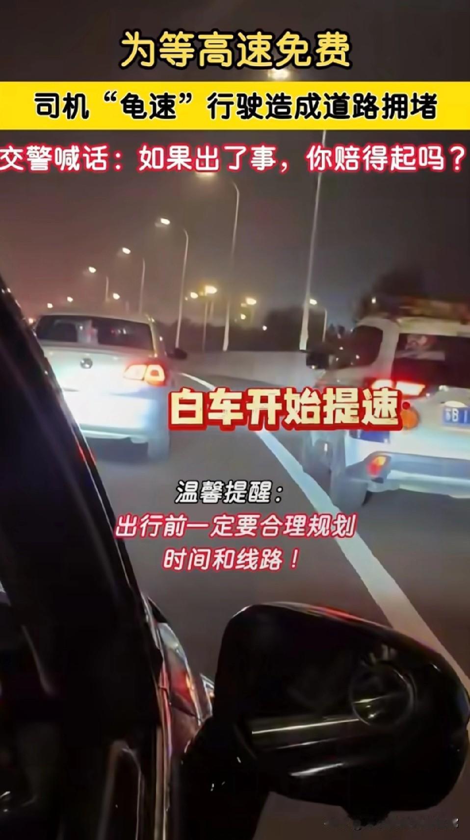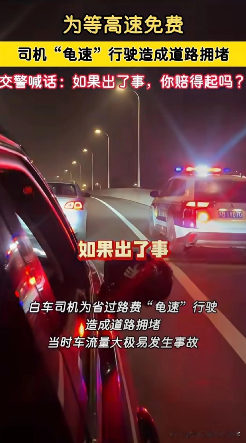 为省高速费龟速行驶,交警怒吼:出了事你赔得起吗 9月30晚江苏一高速上,有司机为蹭10月1日零点后的免费通行,愣是把车开成“蜗牛爬”,直接堵得主干道水泄不通!交警赶到现场气得喊话:“知不知道堵到主线了?出了事你赔得起吗?” 为省几十块过路费,把整条路的通行效率拖垮,还拿安全当儿戏,这波操作到底是“会过日子”还是“缺根弦”? 高速免费是福利,可别为了省这点钱,把自己和别人的路都走窄了。你觉得这种“卡点省钱”的行为该被理解吗?