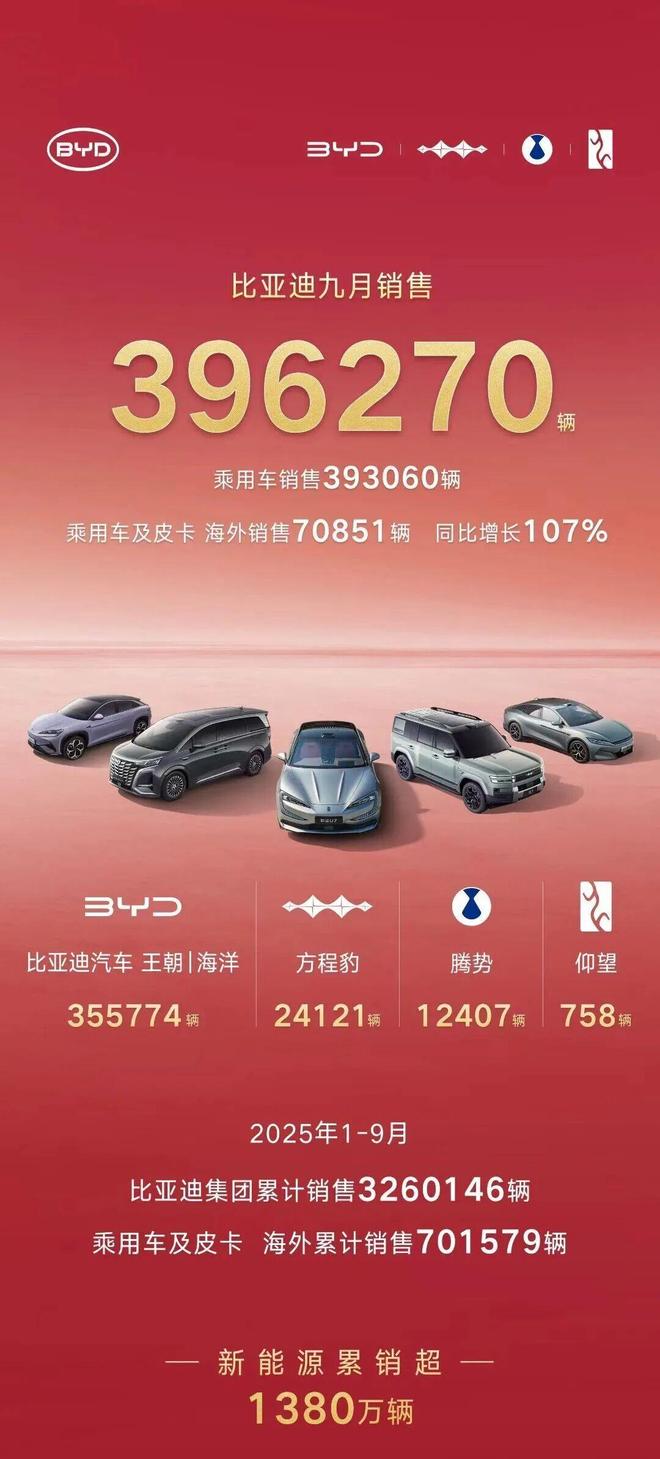 IT之家10月1日消息,比亚迪今日公布了2025年9月汽车产销快报,9月新能源汽车总销量396,270辆,去年同期为419,426辆,同比下滑5.5%。