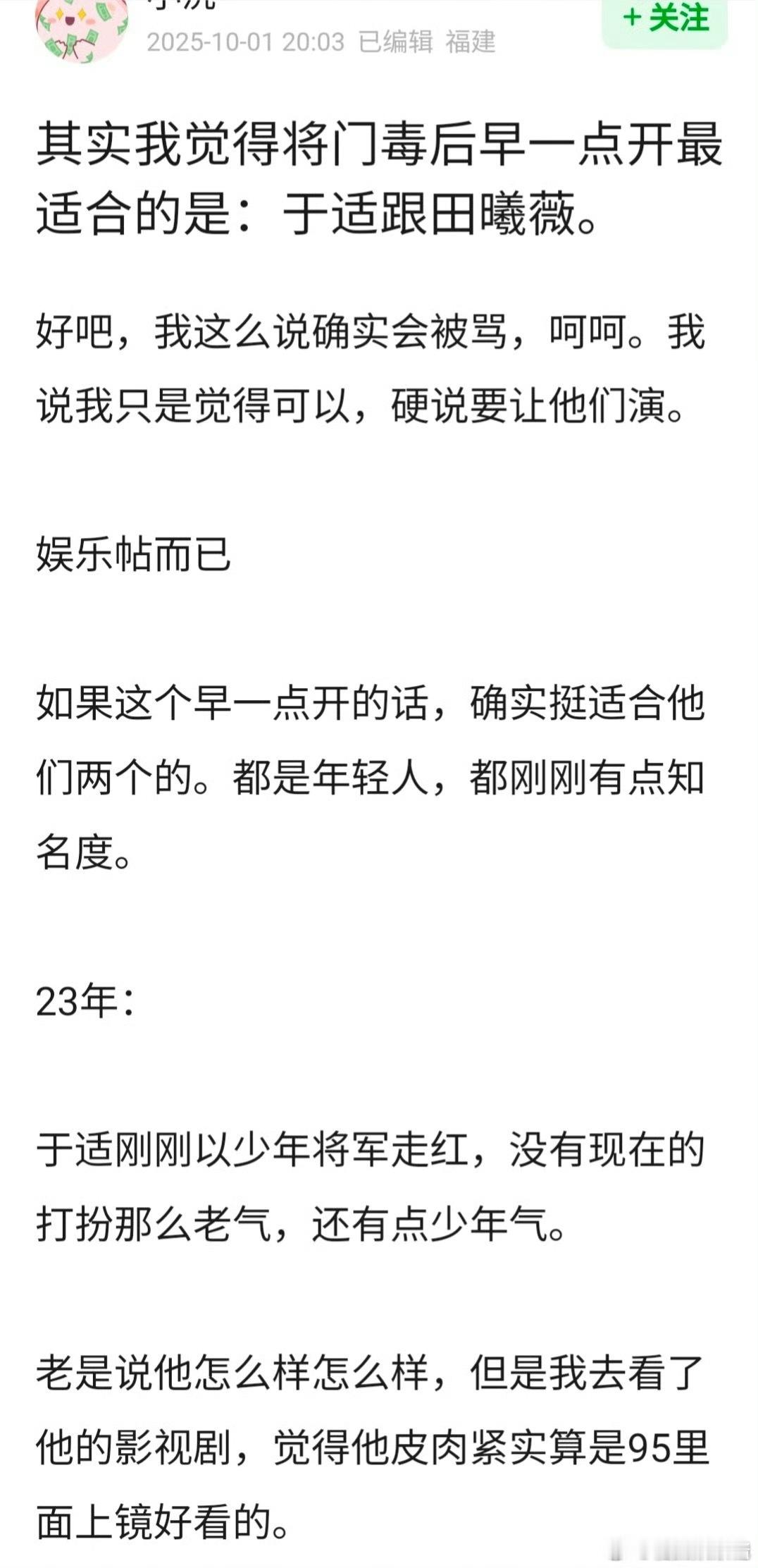网友说如果将门毒后早点开机,田曦薇和于适很搭,你怎么看