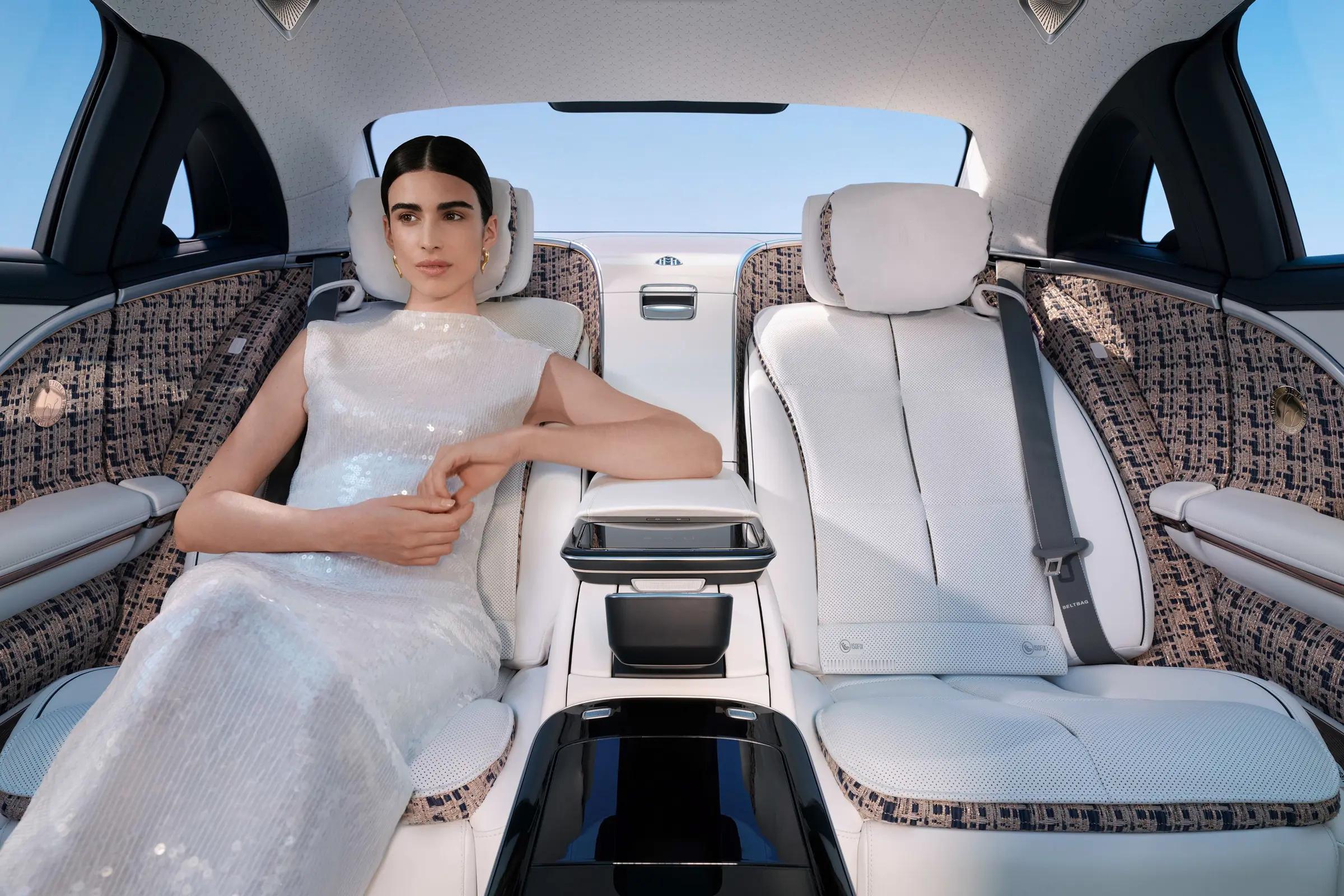 “内饰沿用外观设计色彩概念,以海岳蓝色与玫瑰金色色调,搭配散发温润光泽的水晶白色,使车辆内外色彩和谐相融。受时尚界启发,由蓝色、米色、玫瑰金色和金色编织而成的Bouclé软呢织物装饰于椅套及座垫等细节处,营造视觉上的层次之美。仪表板、车门和座椅均以水晶白色皮革包裹,内嵌脚垫则由亚麻和