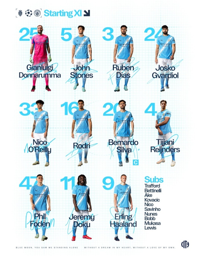 曼城首发:25-多纳鲁马、5-斯通斯、3-鲁本-迪亚斯、24-格瓦迪奥尔、33-奥赖利、16-罗德里、20-B席、4-赖因德斯、47-福登、11-多库、9-哈兰德