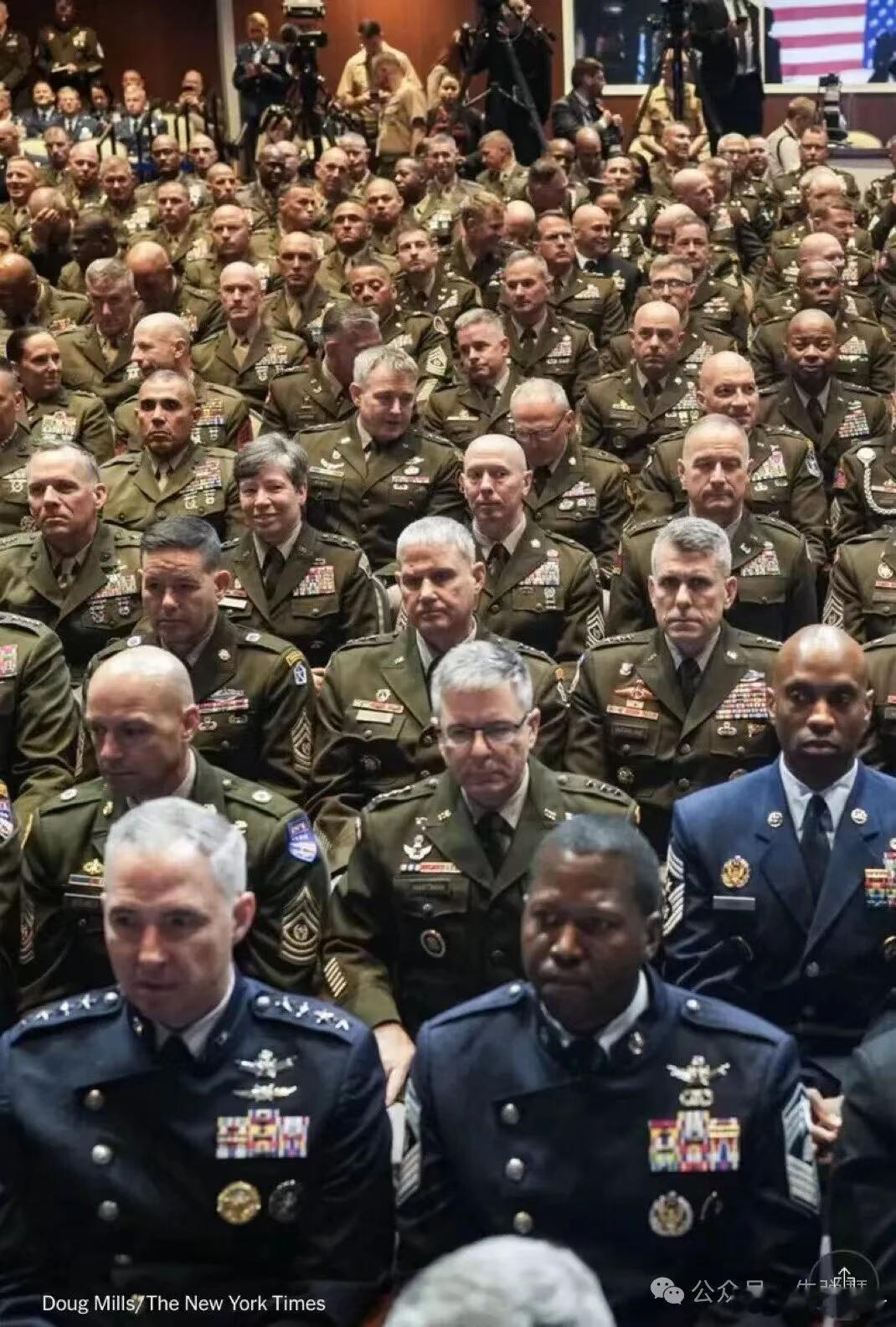 比如,要对“有害领导力”“霸凌和欺凌”政策进行全面审查,要终结“如履薄冰”和零失误的指挥文化,要解放已经被“武器化”的监察流程等……“(军队里)以后不会再有身份月,不会有DEI办公室,不会有穿裙子的男人。不再有气候变化崇拜,不再有分裂、分心或性别妄想。”赫格塞思说,“正如我之前说过的,并且会再说一遍,我们已经结束了那种狗屎。”美国军队要有大变革。他还对将军们说:“看到肥胖的将军们出现在五角大楼的大厅里,并在世界各地担任领导职务,这是不可接受的。这看起来很不雅,而且不符合我们的本性!”