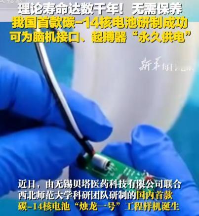 ·中国正式宣布:首款核电池问世,西方专家:先进得不像中国发明!说白了,核电池不是我们平常用的电池。它能把放射性同位素的衰变能量直接转化成电能,输出非常稳定,寿命可以长到不可思议的地步。 传统的电池技术,不管是锂电池还是超级电容,都有很难跨越的寿命限制,手机两三年电池就不行了,电动车续航一直是消费者的焦虑点,而“烛龙一号”的出现,直接把这个桎梏打碎。 这种碳14微型核电池,可以实现连续千年的稳定发电,几乎不会出现衰减问题,相比对照,所有依靠化学反应的电池都像是被锁在笼子里,而核电池彻底跳出了这个框架。 这一突破没有停留在实验室,而是真实走进了实际应用,它的体积极小,能够被用在医疗设备、无人平台、甚至太空探测器上。 它的意义不只是又多了一种能源形式,而是为未来各个关键领域提供了一个新的方向。 西方专家之所以震惊,就是因为在他们长期掌握话语权的领域,中国一下子完成了技术落地,这种突破力量,出乎很多人预料。 在太空探索上,这种电池直接击中了行业的最大短板,现有航天器依赖太阳能板,可一旦进入阴影区或者远离太阳,就会面临电力不足的问题。 很多深空探测器,不是技术不行,而是电池耗尽让它们提前报废,如果搭载核电池,情况就完全不同了。 哪怕在宇宙最黑暗的角落,探测器依然可以稳定运转几十年甚至上百年,这无疑会彻底拉开人类探索宇宙的深度和广度。 而在医疗场景中,核电池的作用更为贴近生活,很多植入式设备,比如心脏起搏器、脑部刺激仪,现在都需要依赖传统电池。 电池一旦耗尽,患者就得再次上手术台,仅仅为了更换电源,而“烛龙一号”体积小、能耗稳定长久,未来完全有望实现一次手术,终身供电。 这对于患者来说,不仅减轻了身体负担,也减少了风险和经济上的拖累,这种改变,是面对疾病的人最迫切想要看到的。 未来的无人机、电动汽车、深海潜航器,同样会因此而焕然一新,今天人们总抱怨无人机续航太短,电动车跑不远,科研人员在复杂环境下也无法保证能源持久。 而如果使用这种微型核电池,续航问题几乎可以忽略,物流行业、科研考察、国防安全,这些都可能因为它改变运作方式,它不只是一块电池,更是一种打破桎梏的核心能源技术。 那核电池是不是会有危险?事实上,这类碳14电池本身放射性非常低,几乎不会对外造成威胁。 在电池的封装和防护设计上,科学家加入了多层屏障,让放射性物质根本没有机会泄出。 而在日常生活里,真正频繁引发爆炸或者火灾的,其实还是锂电池,这样对比之下,核电池的安全性反而更让人放心。 “烛龙一号”的问世,在告诉全球,一个新的能源时代正在到来,而中国正处于队伍的前列。