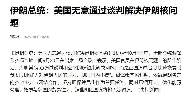 10月1日,伊朗总统佩泽希齐扬对外宣称:美国根本不想通过谈判解决核问题,而是想启动“快速恢复制裁”机制,用制裁压伊朗人民,让伊朗国内乱起来。 要说这 “快速恢复制裁” 机制,本来是 2015 年伊核协议里留的后手,得英法德三国联合提议才能启动,初衷是约束核问题违约方。结果今年 8 月 28 日,英法德在美国撺掇下突然通知安理会,说伊朗 “严重违约”,硬生生把这机制拽了出来。 按规矩,安理会 30 天内没能通过反对决议,制裁就自动复活了,9 月 27 日那天,暂停了近九年的联合国制裁果然全面重启,武器禁运、铀浓缩禁令全回来了。明眼人都看得出来,这背后全是美国在操盘,欧洲三国不过是递刀子的角色。 最讽刺的是美国那套 “谈判话术”,今年 6 月美方还放出风,说同意伊朗搞有限铀浓缩,结果特朗普转头就在社交媒体上翻脸,嚷嚷着 “绝不允许任何铀浓缩”。 到了 9 月底,佩泽希齐扬直接戳破真相:美方居然要求伊朗交出所有浓缩铀,才给三个月 “制裁暂缓期”,这哪是谈判,分明是逼人家缴械投降。 一边喊着 “外交解决”,一边逼着对方接受屈辱条件,这种两面三刀的操作,跟当年谎称伊拉克有大规模杀伤性武器的套路如出一辙。 美国真正的杀招,还是藏在制裁背后的经济绞杀。联合国制裁刚重启,伊朗里亚尔就崩了,黑市汇率跌到 1 美元兑 112 万里亚尔,创了历史新高。食品、房租、水电费跟着疯涨,普通老百姓的日子直接掉进坑里。 更要命的是伊朗的中小企业,这些占了全国工业企业 90% 以上、撑起一半工业就业的 “毛细血管”,直接被制裁掐住了脖子。上海外国语大学的专家说得直白,美国就是想靠经济施压激化内部矛盾,让伊朗自己乱起来,这比军事打击成本低多了。 可美国没想到,连自己的欧洲盟友都不是一条心。表面上英法德跟着美国吆喝重启制裁,暗地里意大利早就偷偷和伊朗搞起了政治磋商,毕竟以前年贸易额超 70 亿欧元,实在舍不得这块市场。更尴尬的是,欧盟自己都清楚,联合国制裁的杀伤力远不如美国的单边制裁。 联合国只是禁核相关交易,美国却直接封死伊朗石油出口和国际金融通道,搞得欧洲想做生意都没法下手。德国专家干脆戳破窗户纸:这哪是防核扩散,分明是欧洲为了讨好美国,报复伊朗支持俄罗斯,顺便让以色列 “替欧洲做了脏活”。 美国的小算盘打得精,可伊朗也没那么容易认输。佩泽希齐扬早就放话,伊朗已经做好了准备,绝不可能接受屈辱条件。 面对制裁,伊朗直接暂停了和国际原子能机构的合作,还放出话可能退出《不扩散核武器条约》,这都是被逼出来的反击。 更有意思的是,美国喊着要掐死伊朗石油出口,可伊朗的 “影子船队” 一直在灰色地带运转,美方根本拦不住,所谓的 “极限施压” 早就漏了风。 说到底,美国这套 “谈判 + 制裁” 的组合拳,早就被看穿了。嘴上的 “和平” 是给国际社会看的,手里的制裁才是真家伙,目的就是搞乱伊朗、掌控中东。 可如今的伊朗不是当年的伊拉克,欧盟内部也吵成一团,美国想靠老套路得手,怕是没那么容易。佩泽希齐扬的控诉像记耳光,打在了美国的虚伪脸上。真要想解决核问题,就得拿出诚意,靠制裁逼宫的路子,注定走不通。