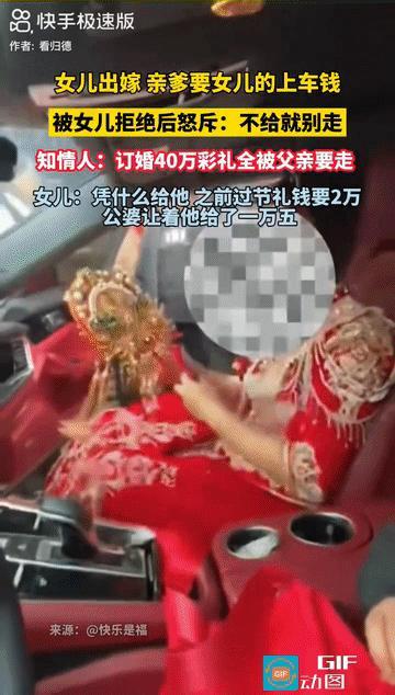 “不给我就别想走!”18岁女儿出嫁当天,亲爸拦在车边问女儿要上车钱,女儿拒绝,他就上手抢。女儿坚决不给,亲爸就拦在车前大声嚷嚷:“不给我就别想走!” 据说女儿的40万彩礼也都被亲爸拿走了,之前过节礼钱都要2万,不给就闹,最后公婆让着给了15000元。没想到现在上车钱也要走,最后还是给了! 对此有网友说:看清楚了人家才18,爸爸是要给她个保障 ,她自己不听话,怨谁? 也有网友说:就一点钱给父亲了又怎样!虽然这位父亲是有点过分了,但请别站在你所谓的道德制高点去评判一件事。想想又有谁不是“为了自己”呢?现在独生子女多得很,即使有心孝敬双方父母,可现实的压力可能连他们自己都没办法照顾好,又何来的照护父母呢?你可以为自己的幸福生活而拼搏。那父母呢?他们为自己的以后打算一下就成了自私?所以开头我就说了,别站在道德的制高点说自己有多高大上,其实就是为了自己! 也有网友说:给彩礼40万都给他干啥 爱你的父母值得你给予所有去孝顺,不爱子女的父母 他们老了一日三餐养老就行,很多父母生了孩子有心爱护,而 有的孩子从出生那刻父母就开始规划了,剥夺他的一切,父母生孩子应该是伟大爱 ,有的只是为了是性而生,不是所有父母都值得被善待被尊重。 说实在我看见过不爱女儿的对女儿不好的,但最起码在结婚当天还是会演一下慈父的,像这种不要见面的还是第一次见,当着亲朋好友的面这样,难堪的是谁啊,女儿以后去婆家要怎么活? 有网友说父亲是为了女儿以后好,想帮她把钱留着,可这样子像吗?40万彩礼都拿去了,上车钱也要拿?差那点钱?不给就抢,就拦着车不让走,这也是为女儿好?这样的好不要也罢! 看女孩也是个拎得清的,嫁人后就断了联系吧,这样的父亲不会满足,以后的日子不好过的! 而遇上这样的亲家,男方家还愿意娶,估计是真的很喜欢这个女孩了,居然哪个父母会让自己的儿子去有这样亲爹的女儿,躲都来不及了! 对此你怎么看? (视频来源:看归德,侵删[祈祷])