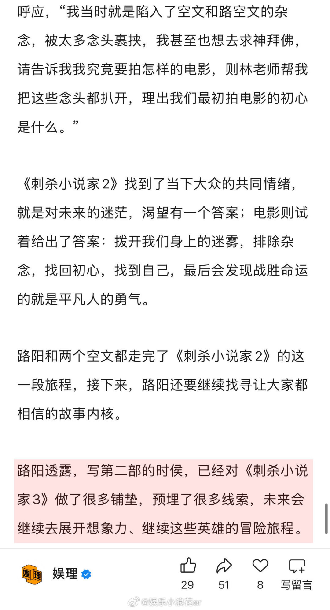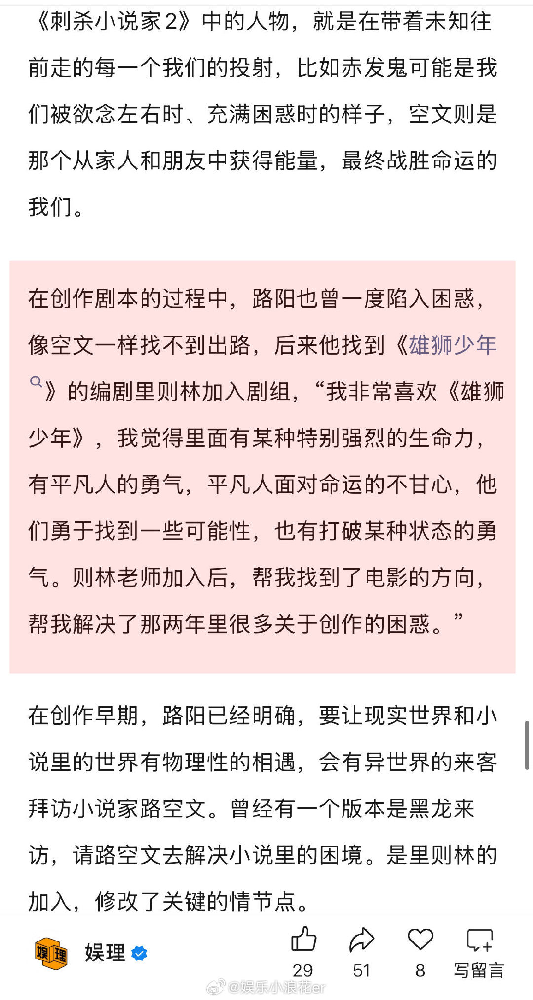 路阳赞丁程鑫表演超出预期 路阳透露刺杀小说家3进度 创作《刺杀小说家2》剧本时,导演路阳也曾一度陷入困惑,后来他找到《雄狮少年》的编剧里则林加入剧组,“我非常喜欢《雄狮少年》,我觉得里面有某种特别强烈的生命力,有平凡人的勇气,平凡人面对命运的不甘心,他们勇于找到一些可能性,也有打破某种状态的勇气…”娱理独家↓