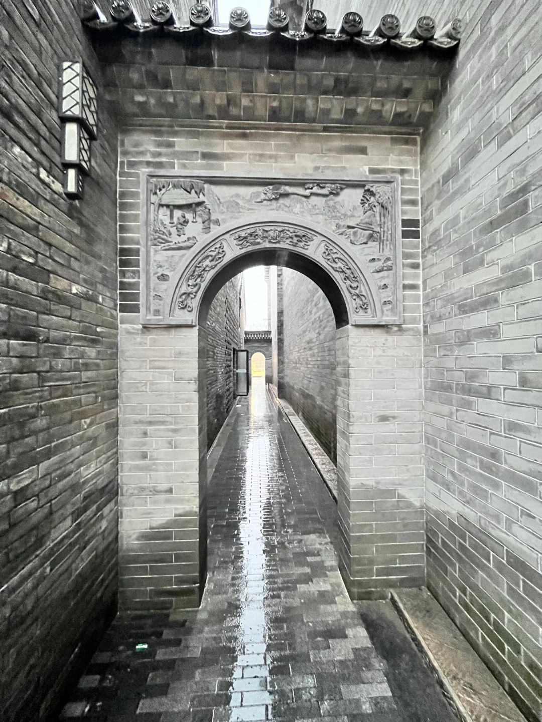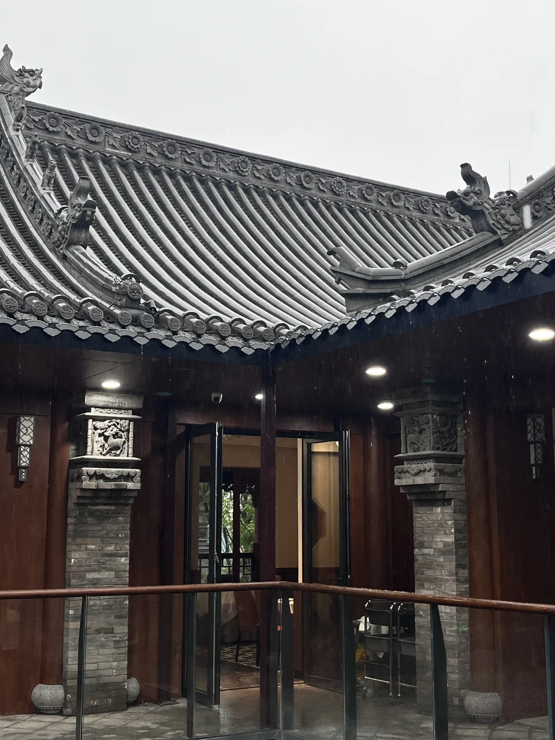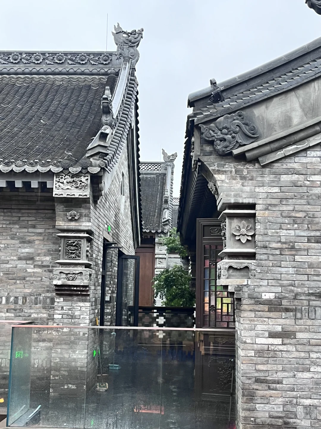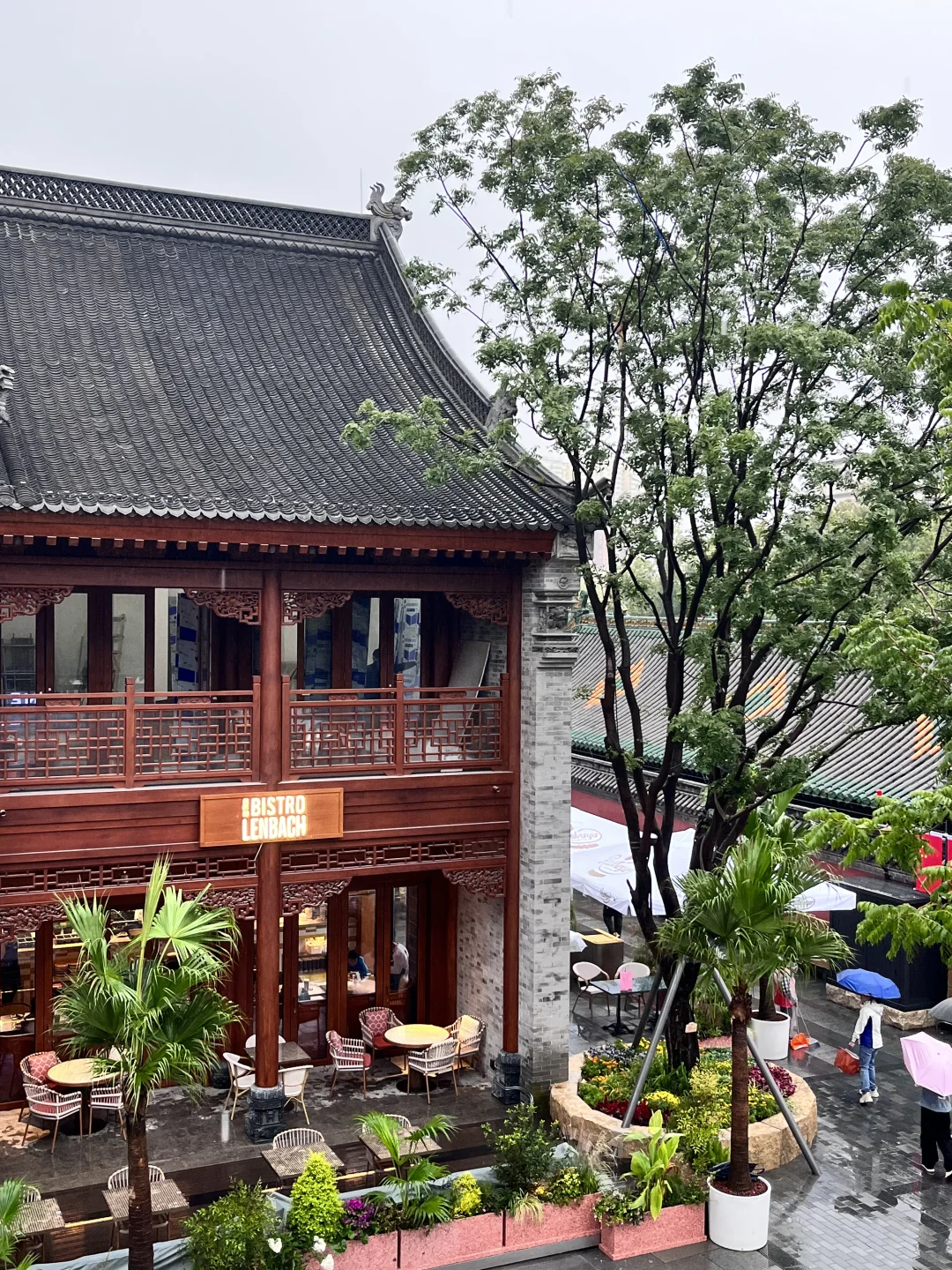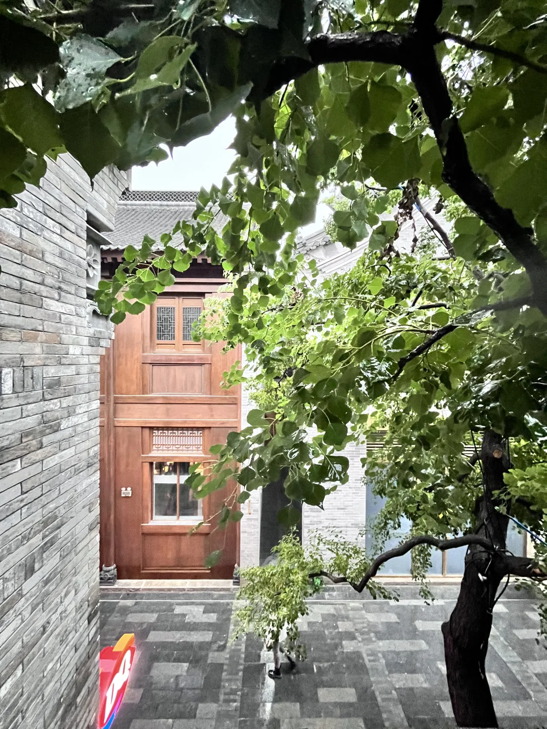 下雨天,打着伞,站在四合院天井下