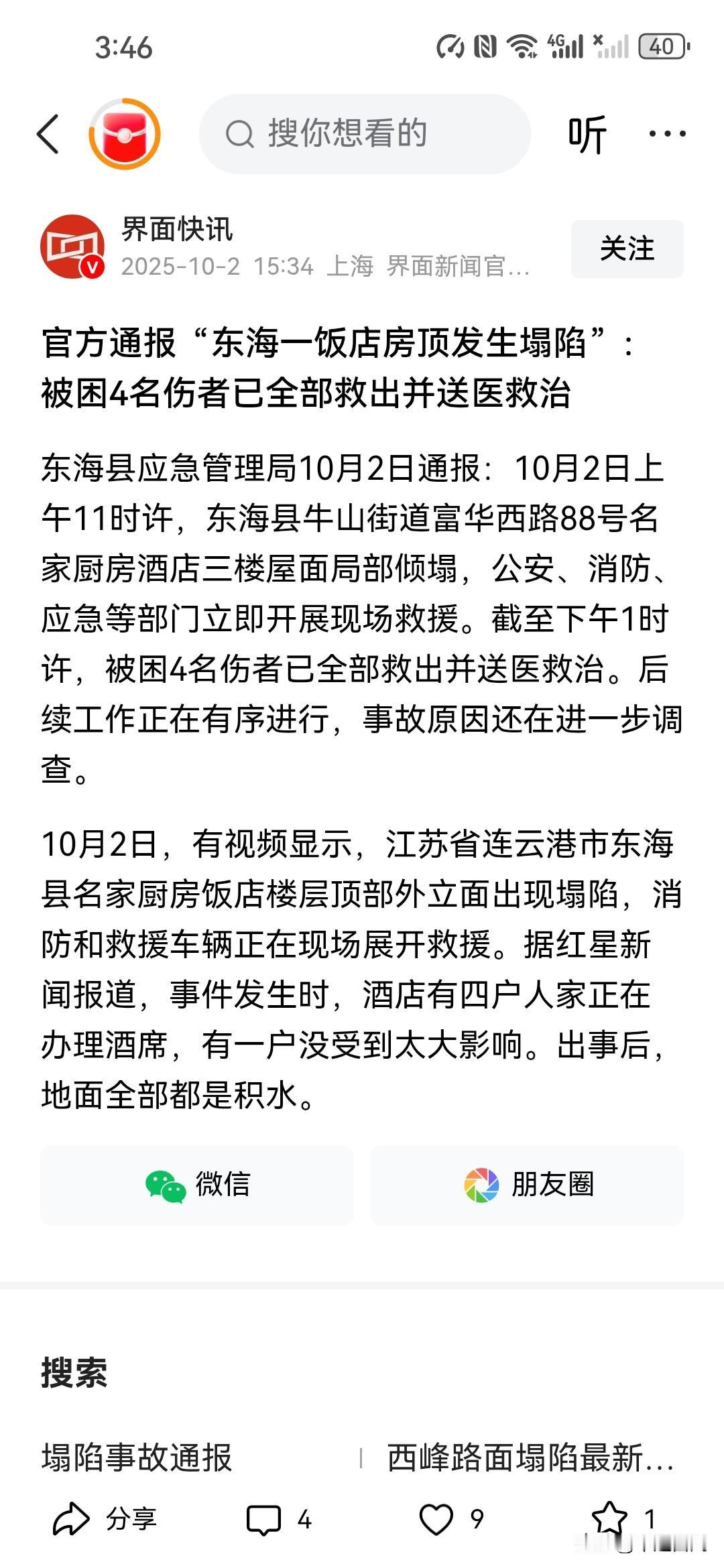 突发状况!东海饭店房顶塌陷,被困的4人已成功救出! 正值国庆节,办酒席的众多,四家喜宴突遭变故沦为事故,其中一家受影响最小,算是运气较好。此次塌陷的应是挑空的钢结构拼接顶,类似加油站那种顶棚垮塌,要是主体结构出问题,那可就麻烦大了!